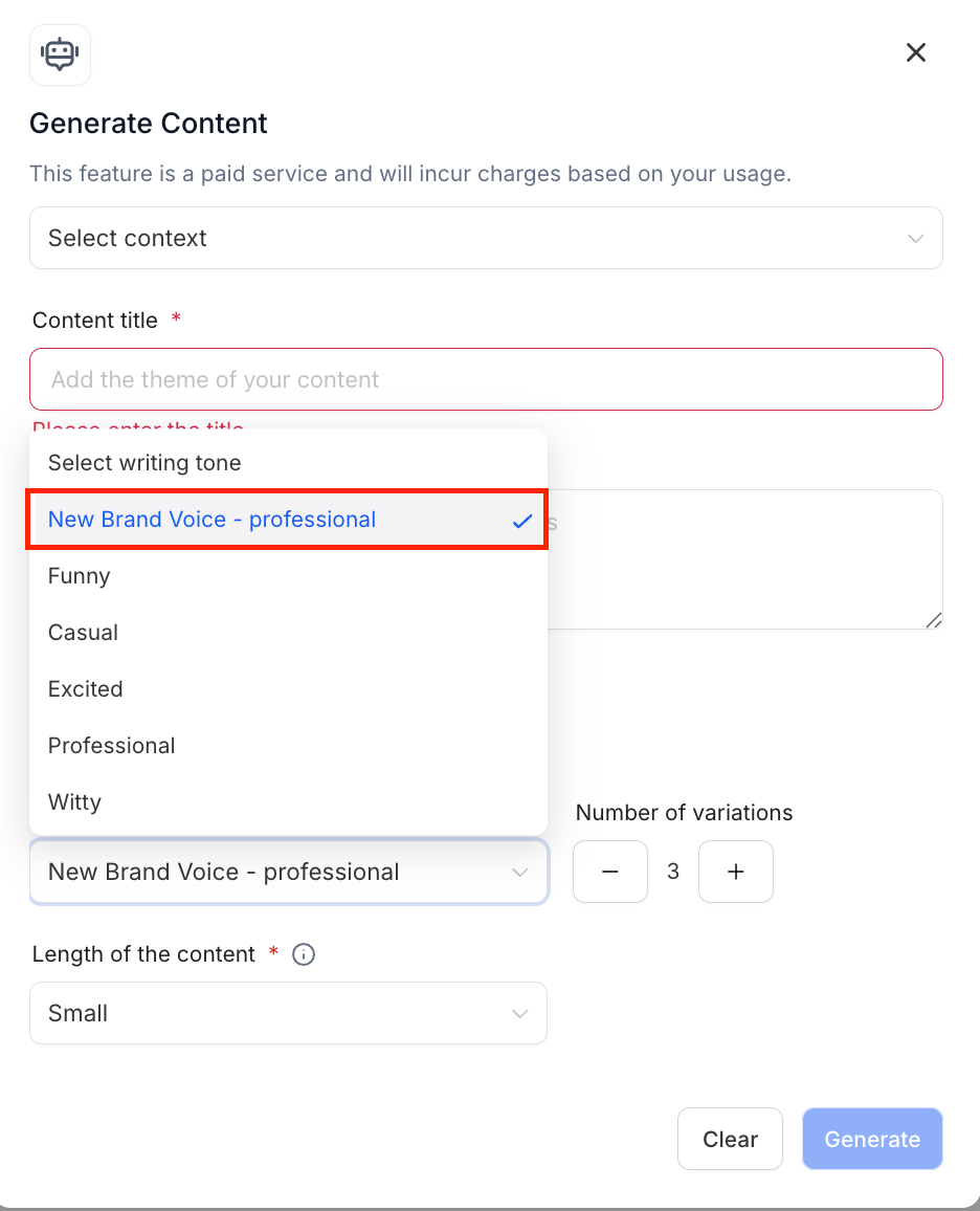 As of now, you can see Brand Voice as a tone can be selected in the Content AI modal