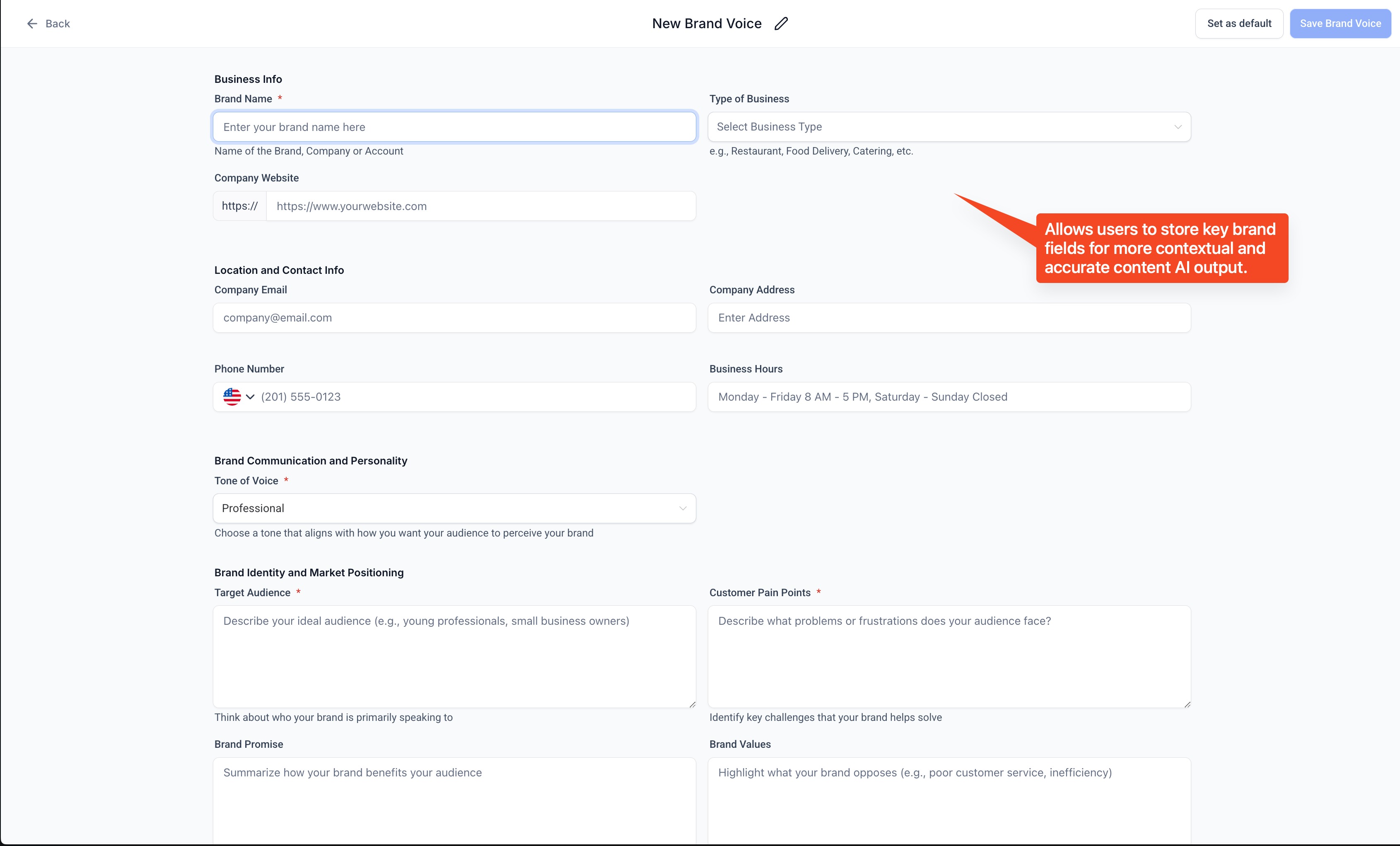 Fill in the form with your brand's business information, values, tone, and style guidelines.