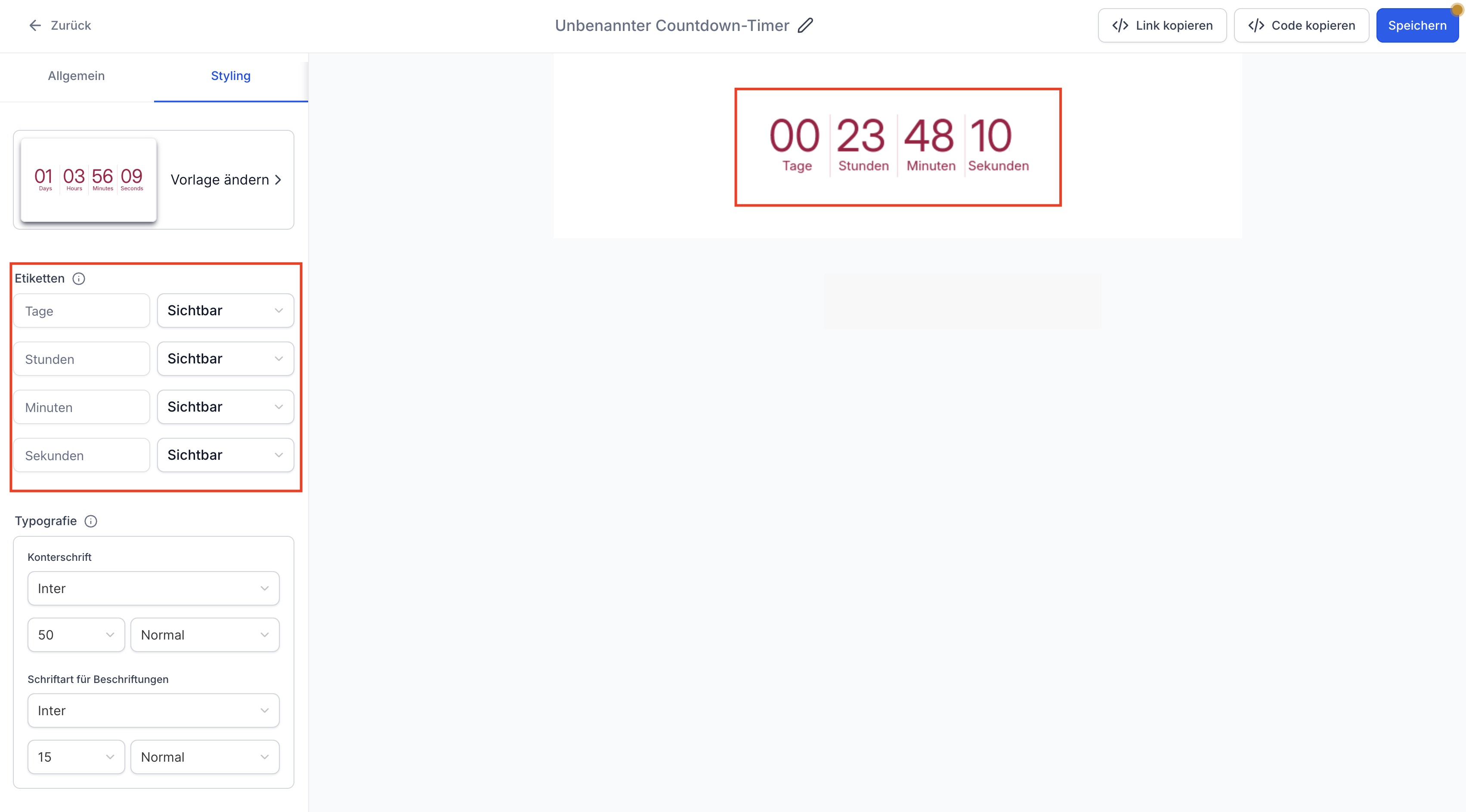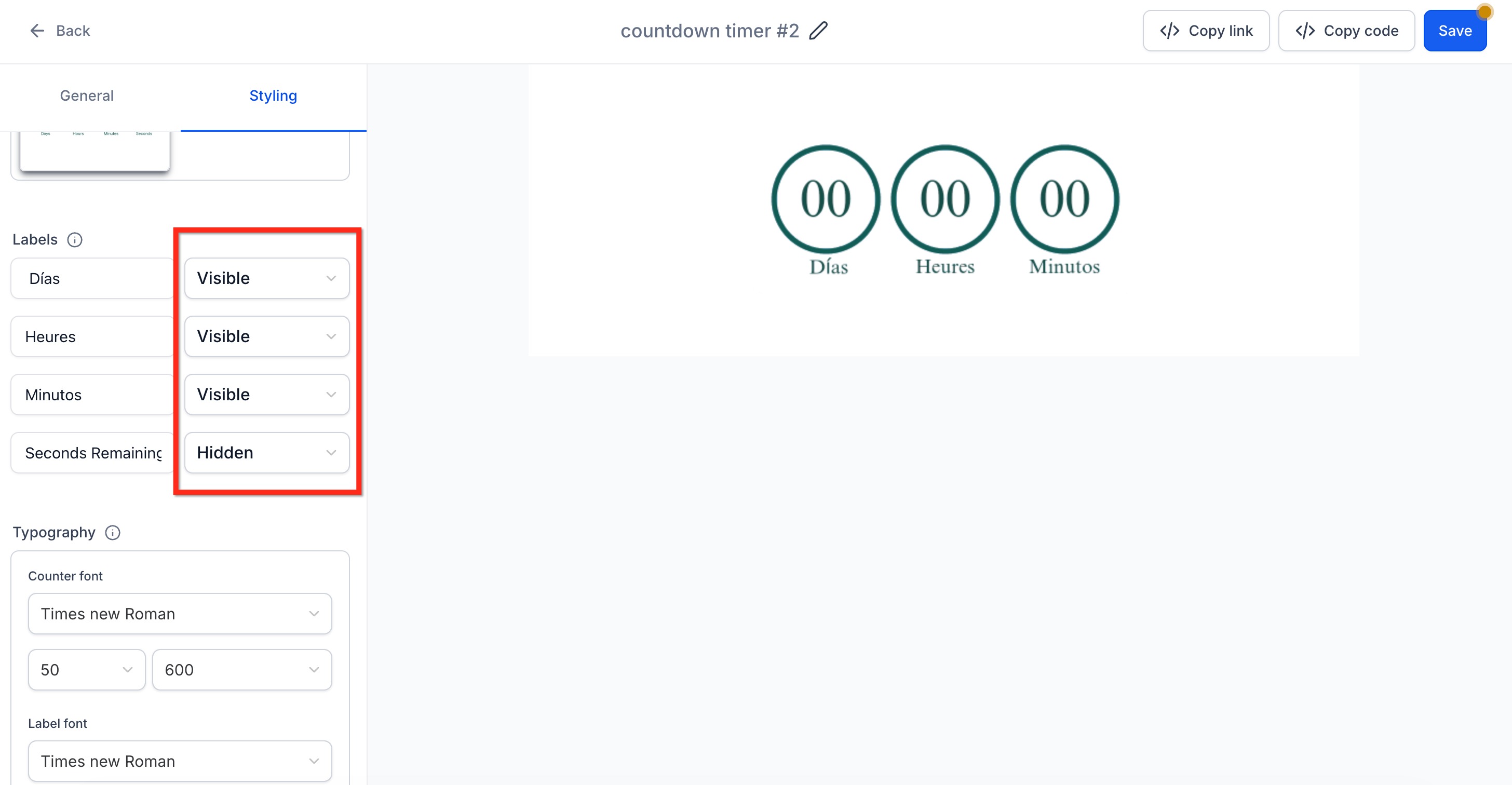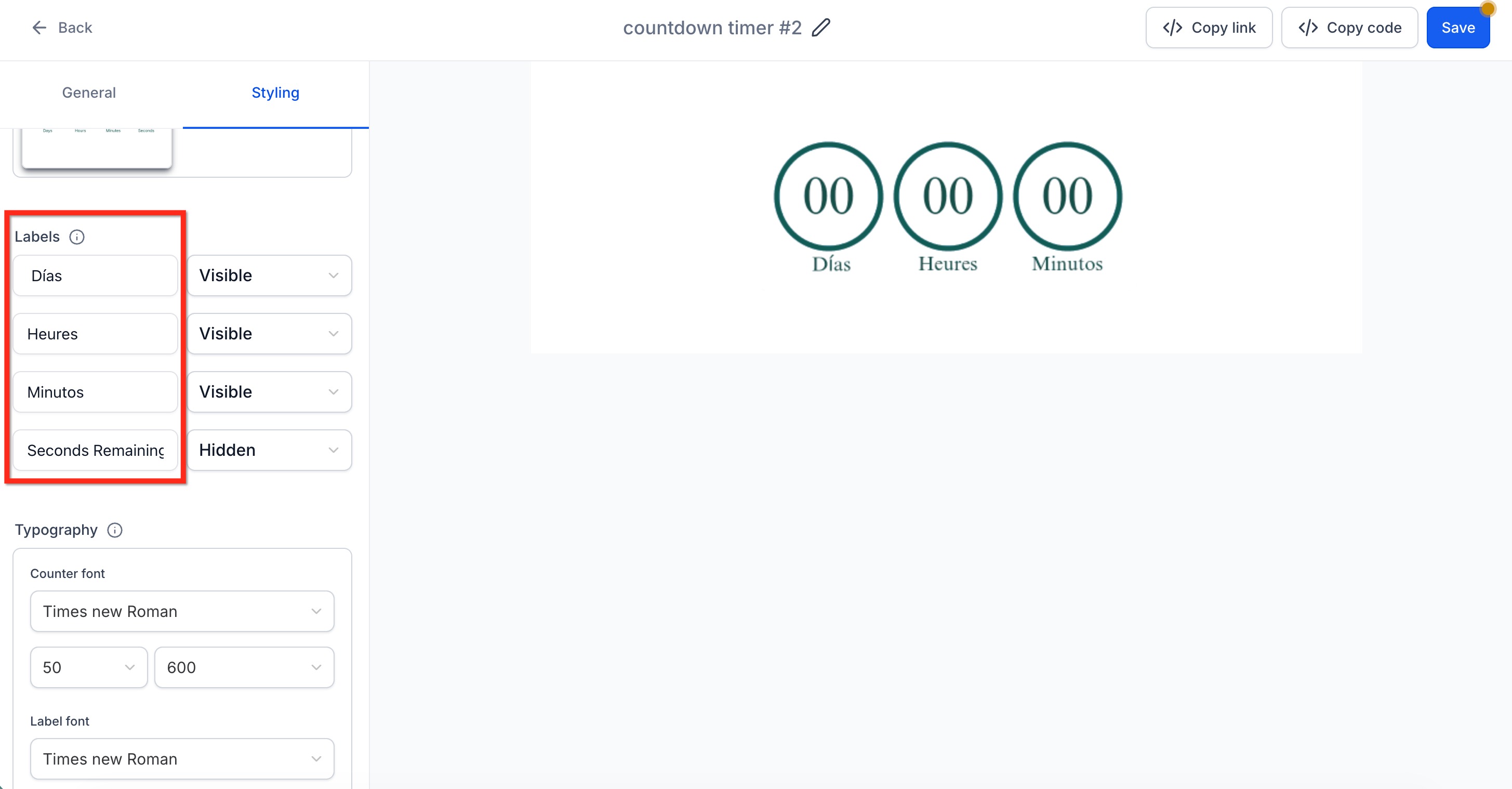 Countdown Timer uses your account’s locale to set starter labels automatically. You can leave these as-is or tweak them to accommodate slang, abbreviations, or fully custom copy.