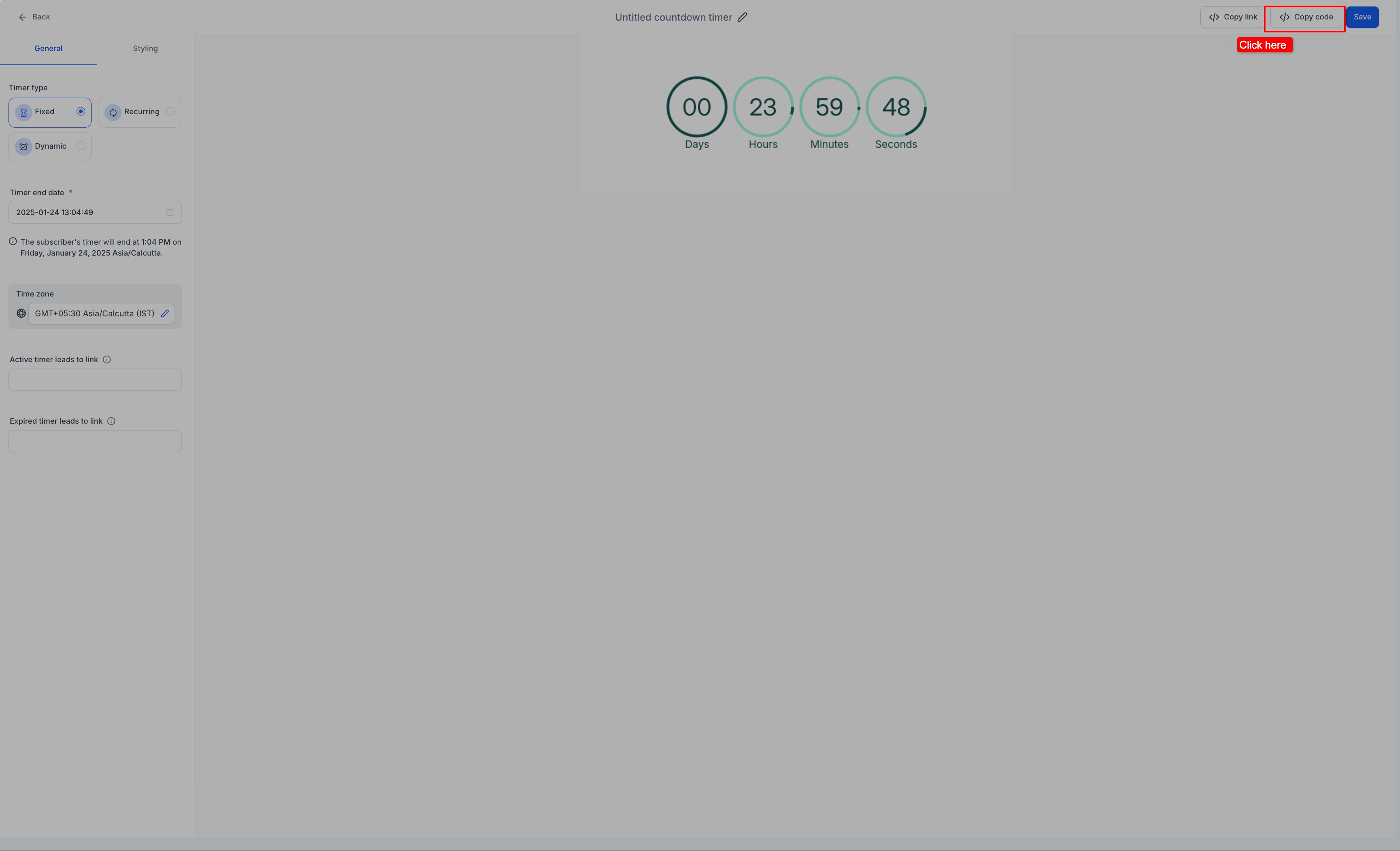- If you're sending an email campaign, you can use the "Copy Code" feature to get the timer code that can be inserted into your email's HTML.