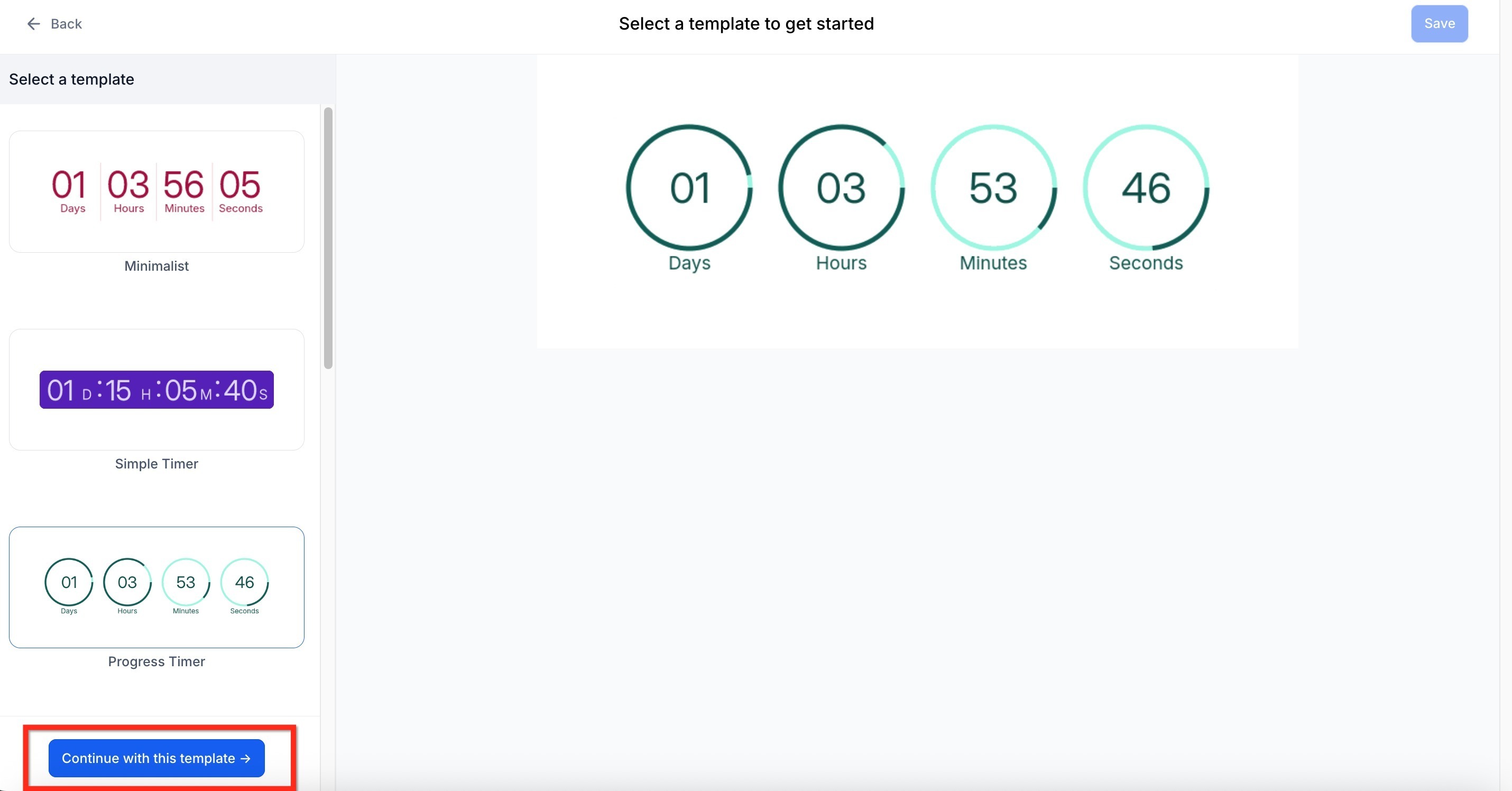 2. Choose a Countdown Time template and click Continue with Template.