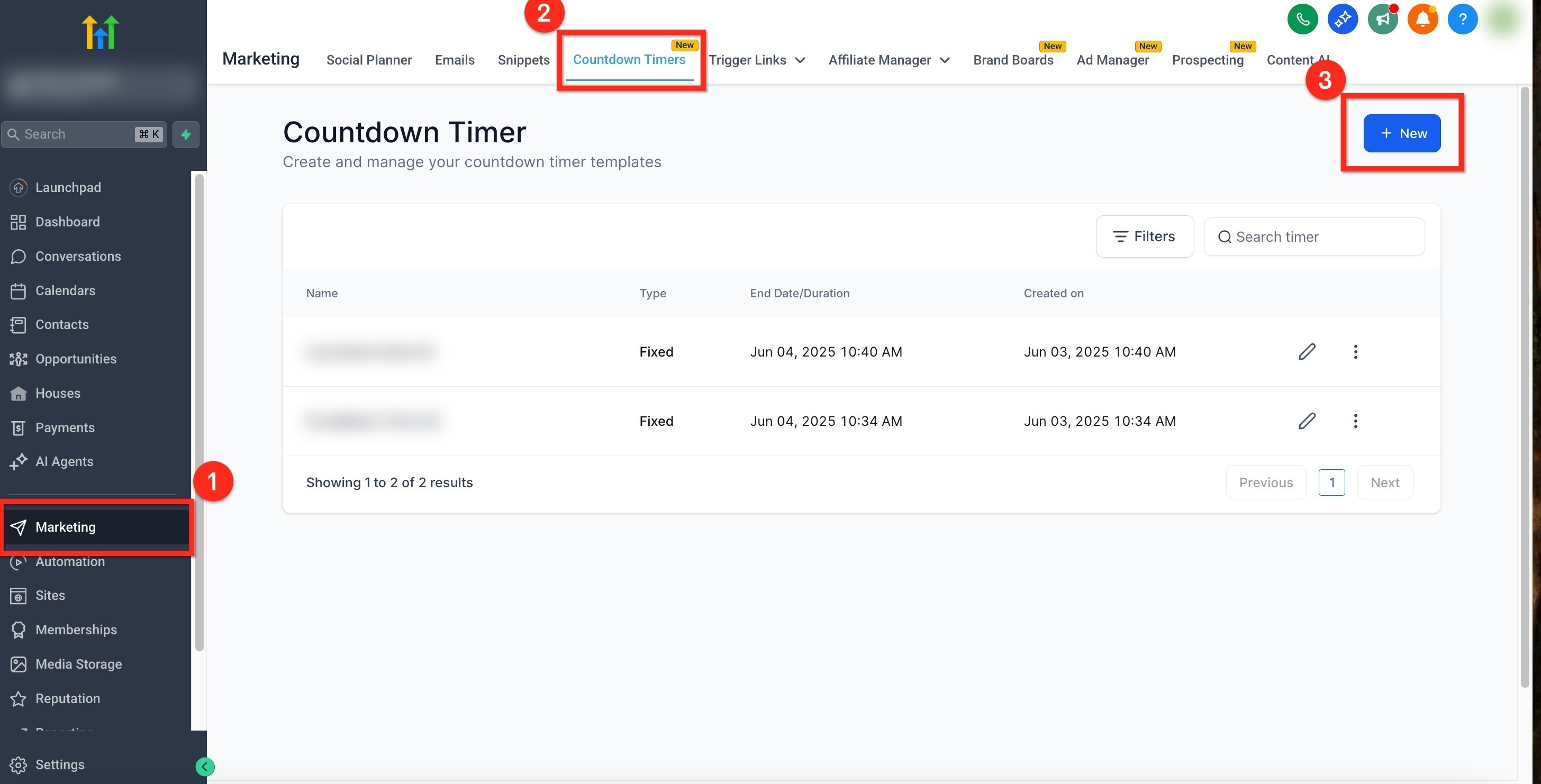 1. Navigate to Marketing > Countdown Timers. Click the blue + New button to create a new countdown timer