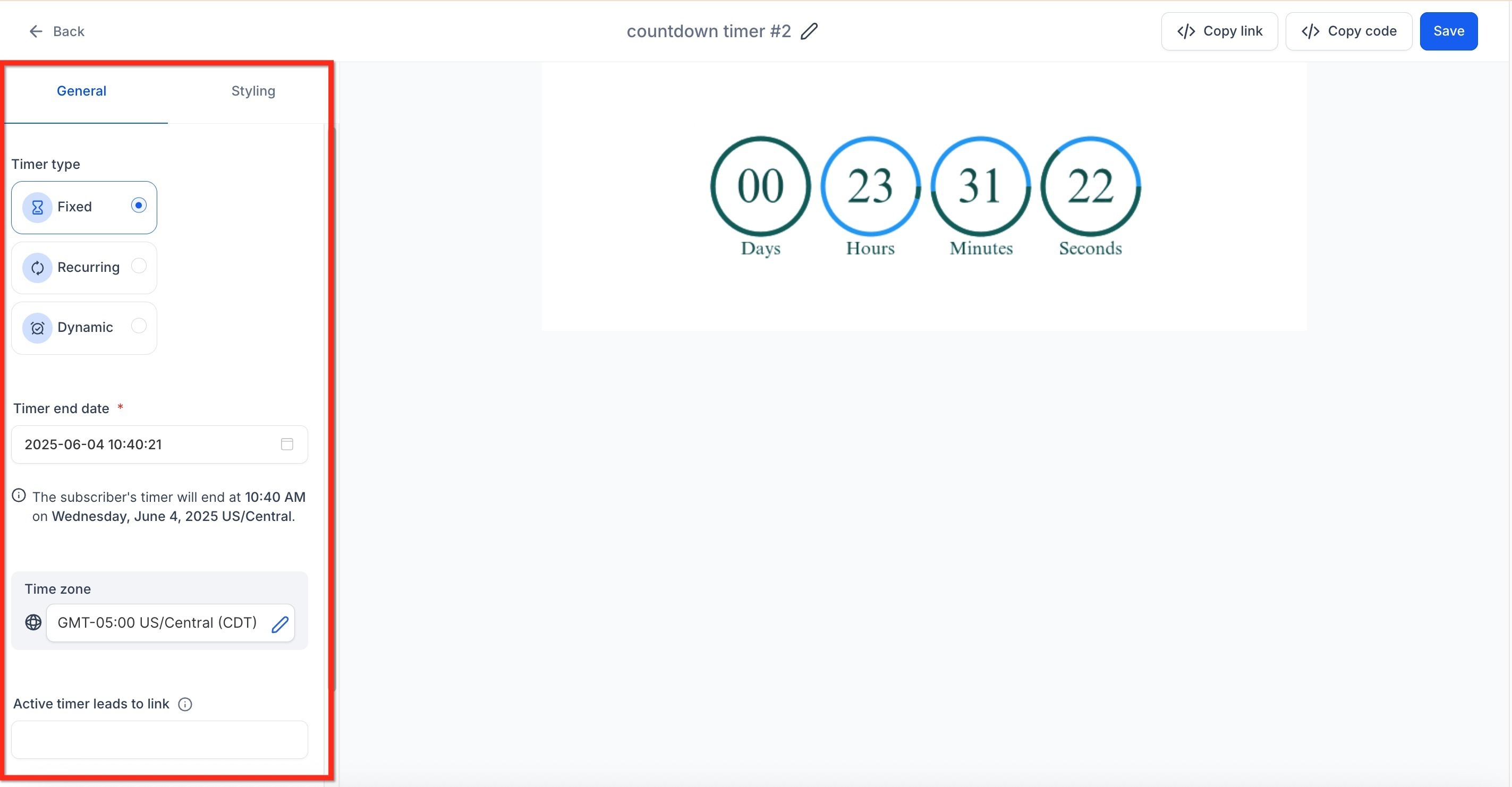 Fixed timers ends at a specific global date/time. Recurring timers reset after a defined interval (e.g., every day at 9 AM). Dynamic timers are personalized countdown that begins when a contact opens an email or visits a page.