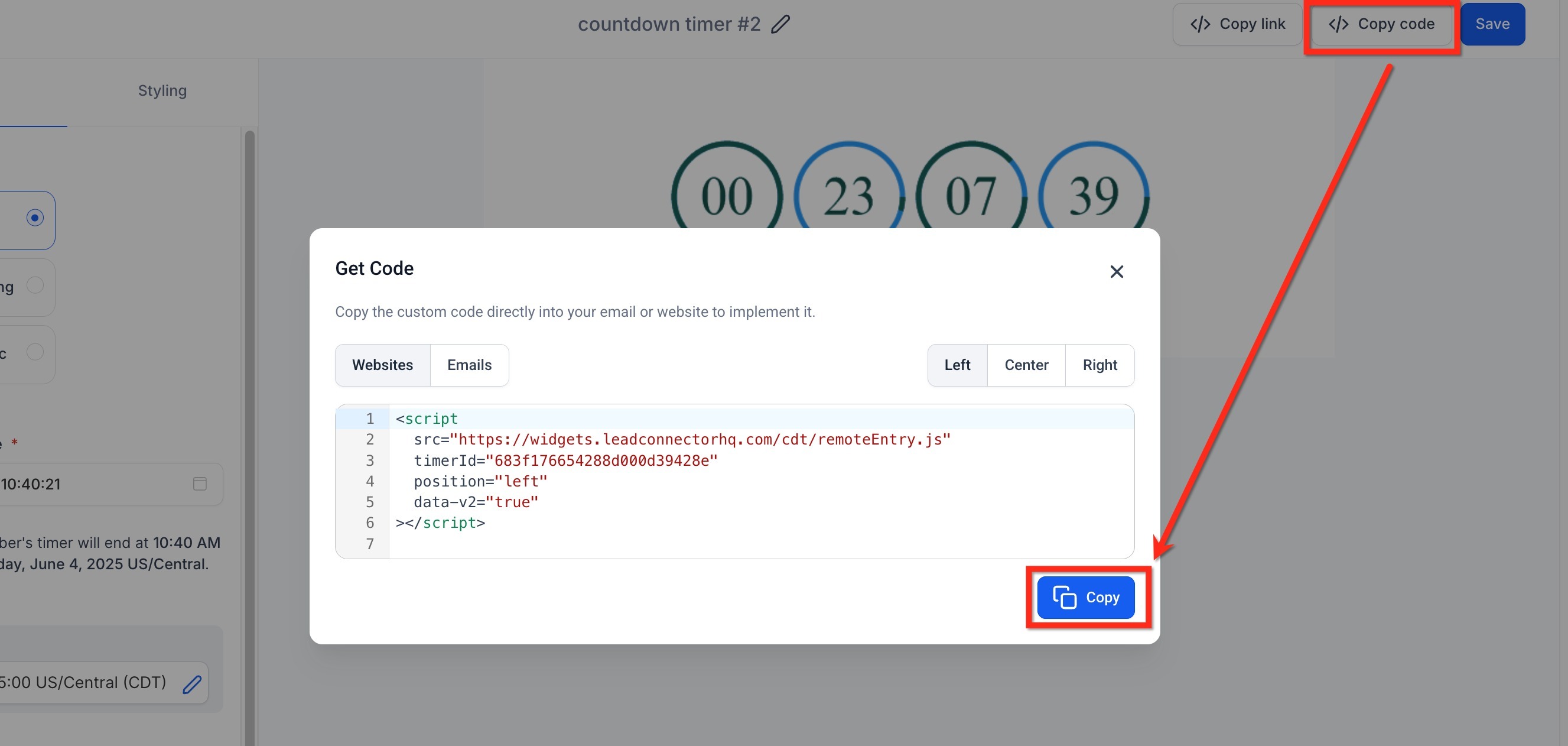 Embed your countdown timer using code, helpful if you're adding it to a third-party platform. For more info on copying code from a countdown timer, click here.
