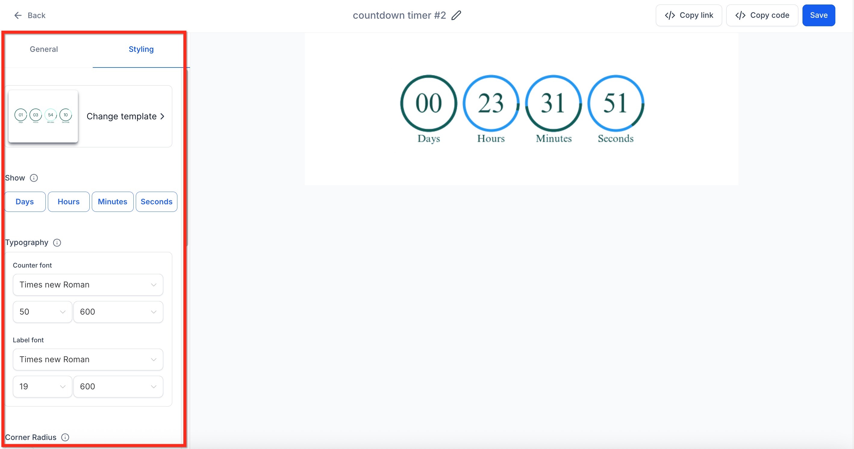 5. Under the Style tab on the left, toggle which time units to display (e.g., hours, minutes, seconds) and customize the timer’s font, size, and color using the style controls.