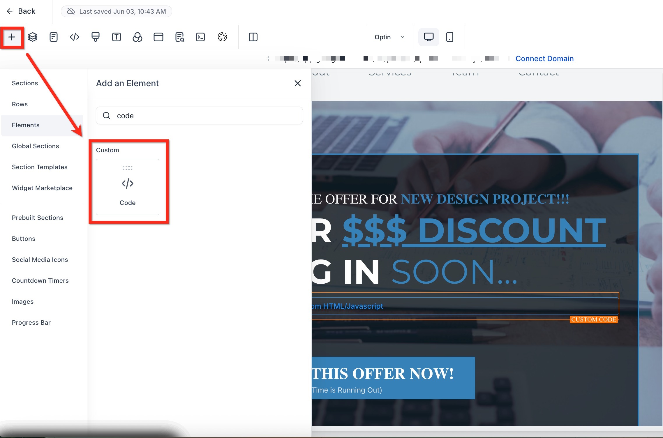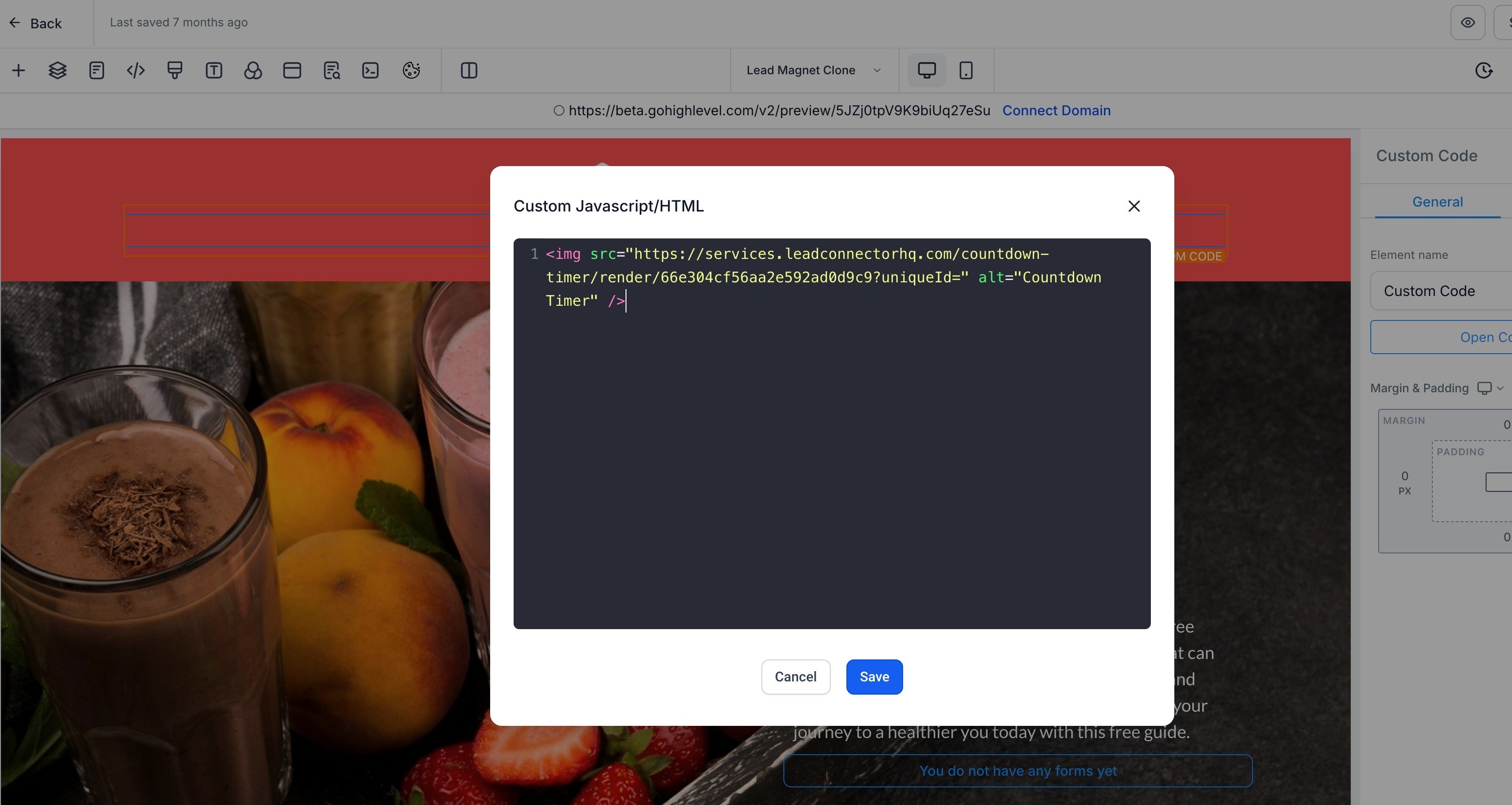 5. Select the Code element and drag it where you want the timer to appear.