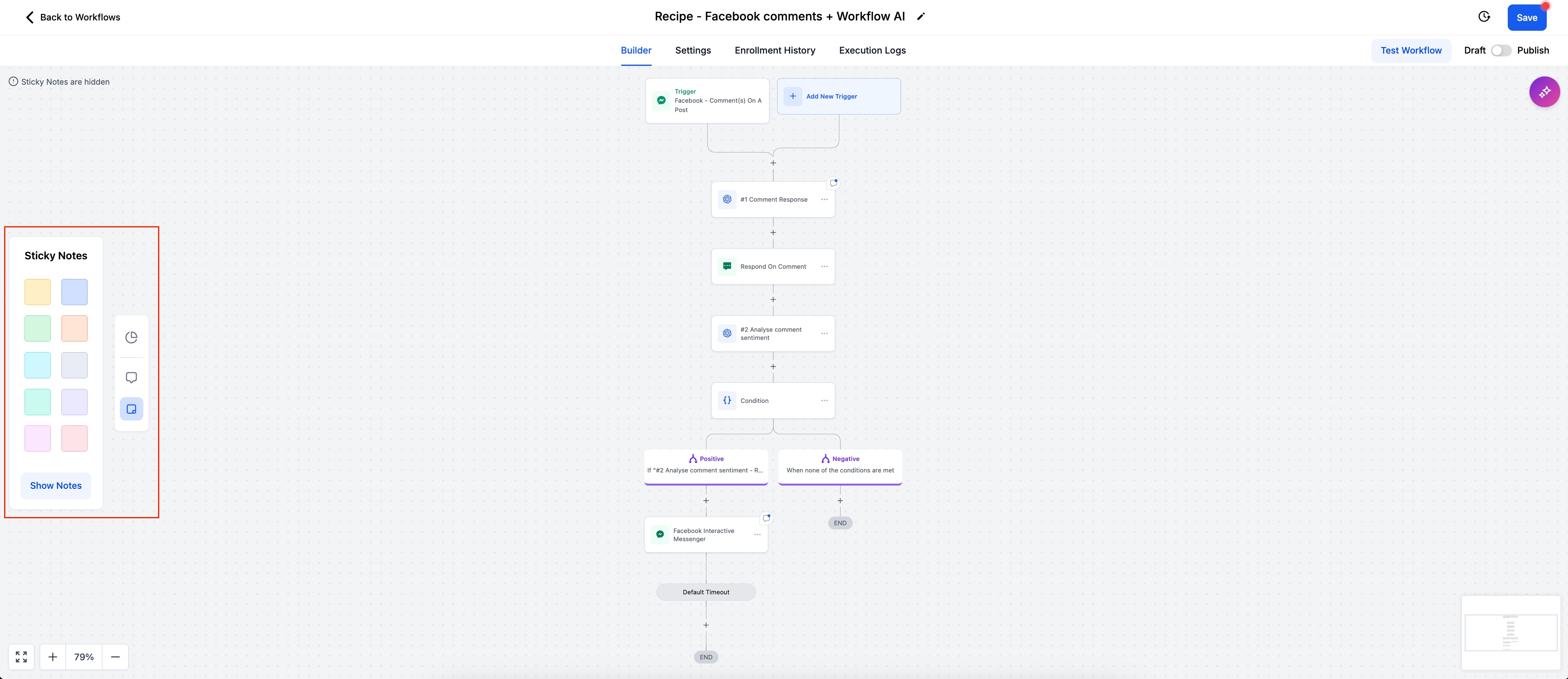 - Sticky Notes allow users to add highly visible notes to the workflow builder, providing quick access to important information. These notes stay pinned to the builder, making them useful for communicating critical information or reminders across teams working with the same contact.