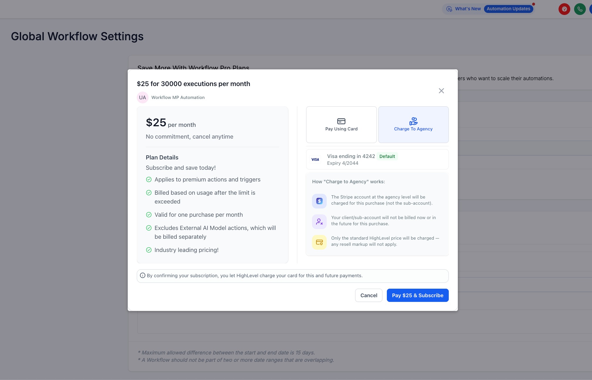 The Workflow Pro Plan is an add‑on subscription specifically for managing premium workflow triggers and actions. It sits alongside your main GoHighLevel plan (such as Agency Pro or Agency Unlimited) and handles only the extra‑cost executions. With Workflow Pro, agencies can bulk‑purchase premium triggers and actions at a discounted rate, then resell or allocate those executions to their sub‑accounts. This separation ensures that your core platform features (CRM, website builders, base automation workflows) remain on your primary plan, while all premium workflow costs are consolidated and controlled through the Pro add‑on.