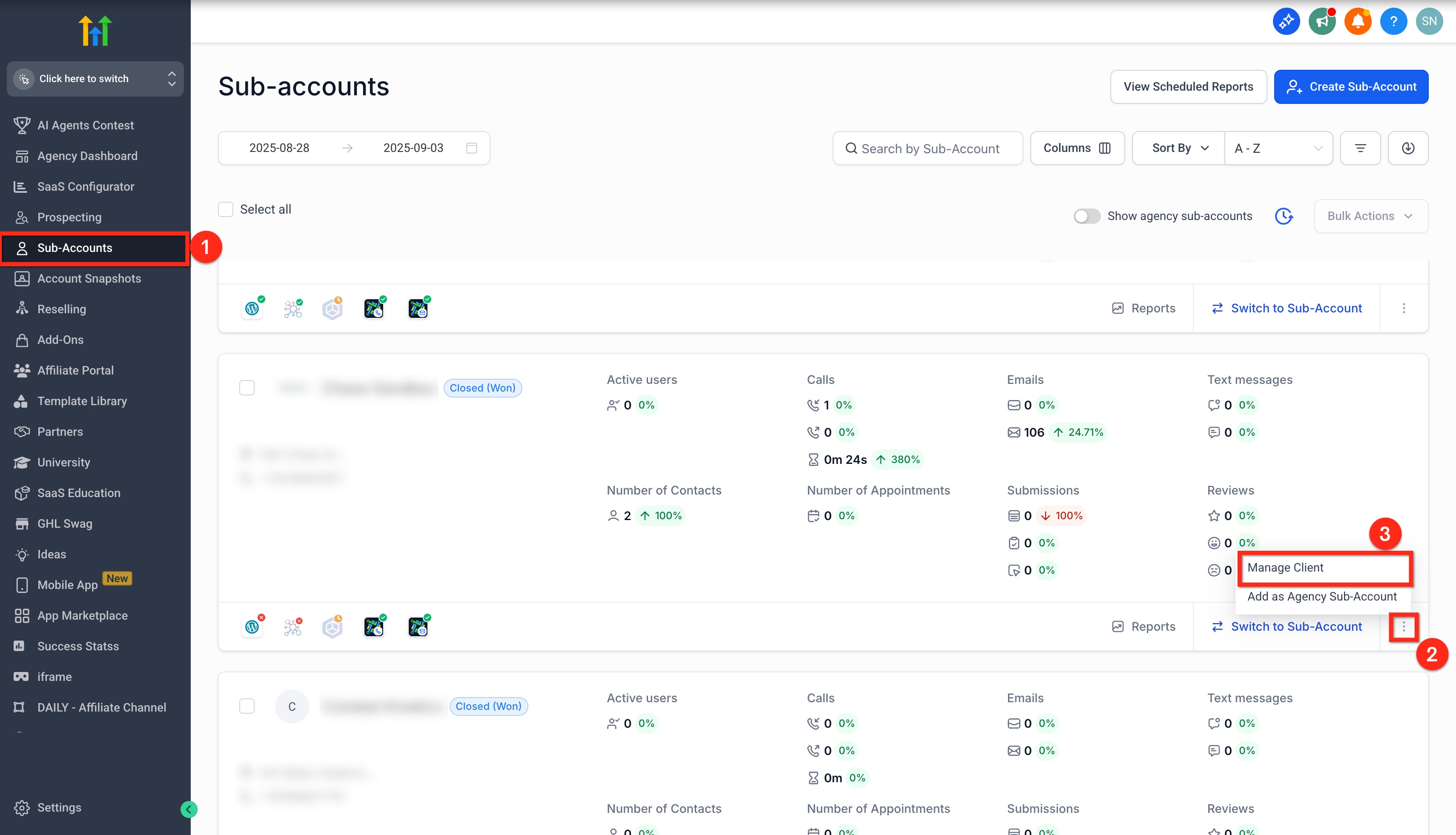 - Find the sub-account and click the three dots next to switch sub-account button.