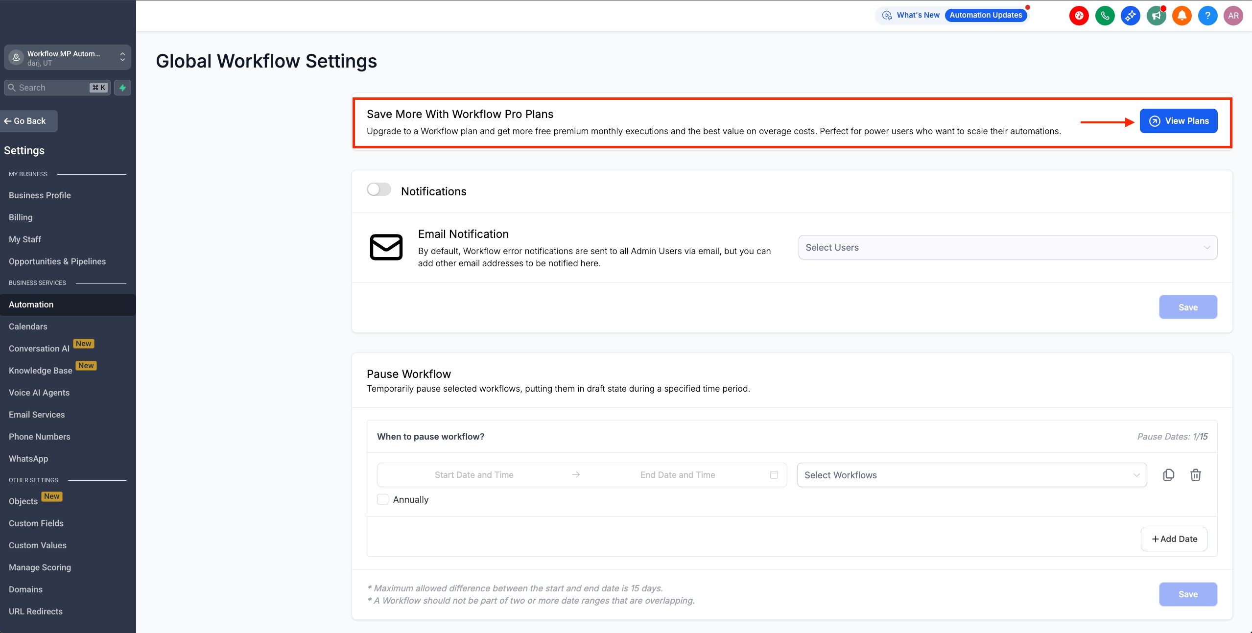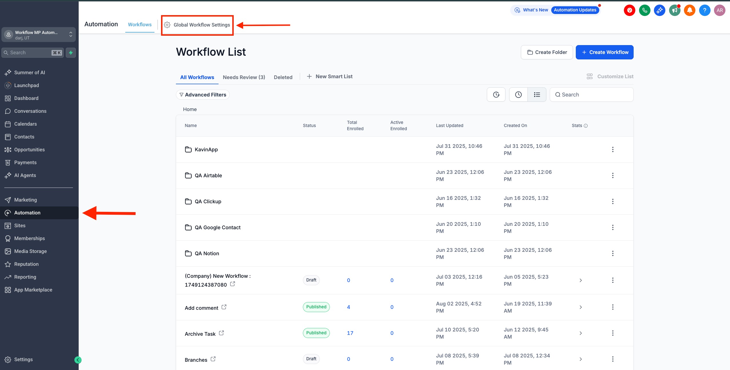 - From the sub-account, navigate to Automations and click Global Workflow Settings