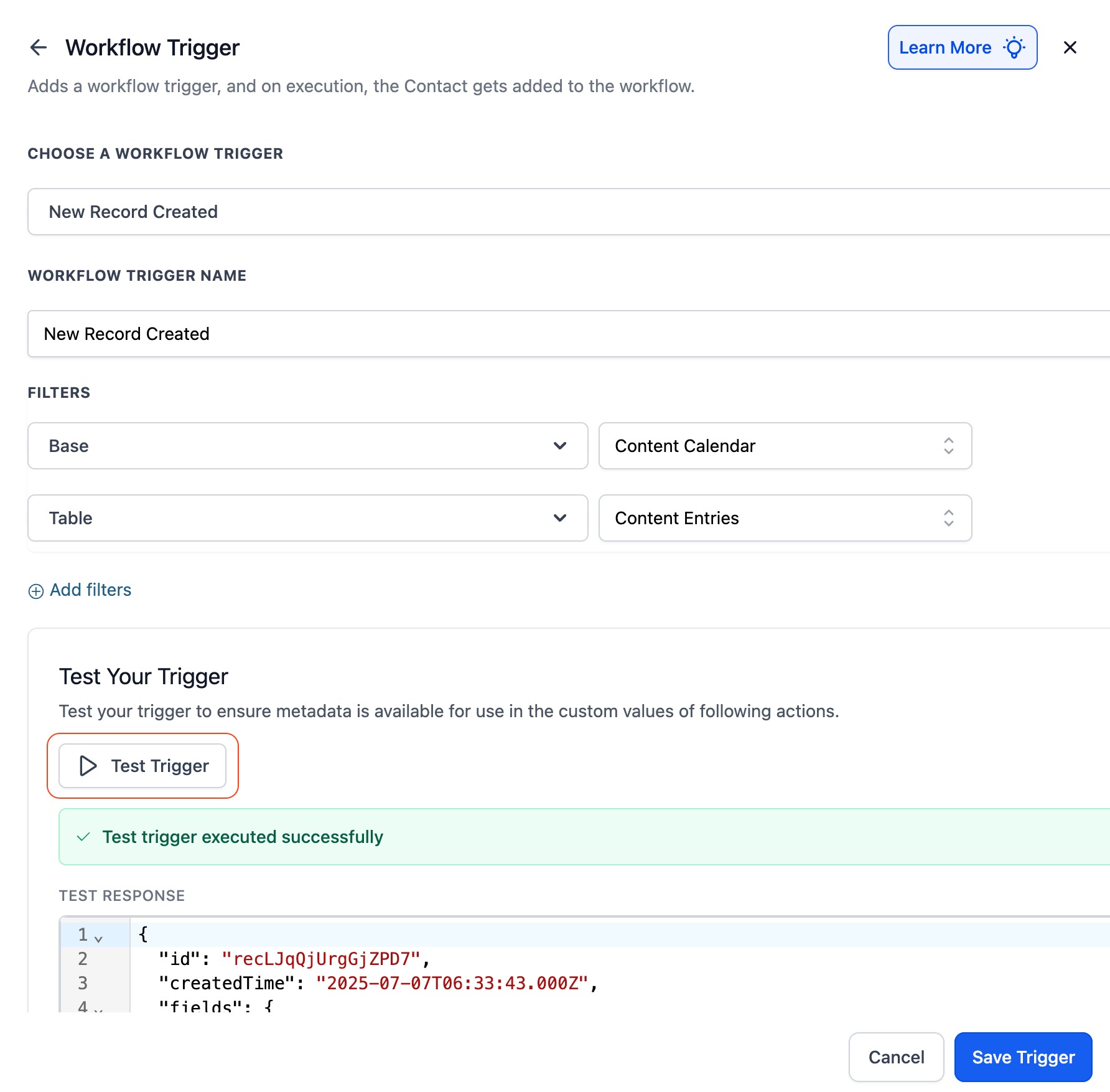 Test Trigger is required to pull metadata that can be used in subsequent workflow actions through custom values.