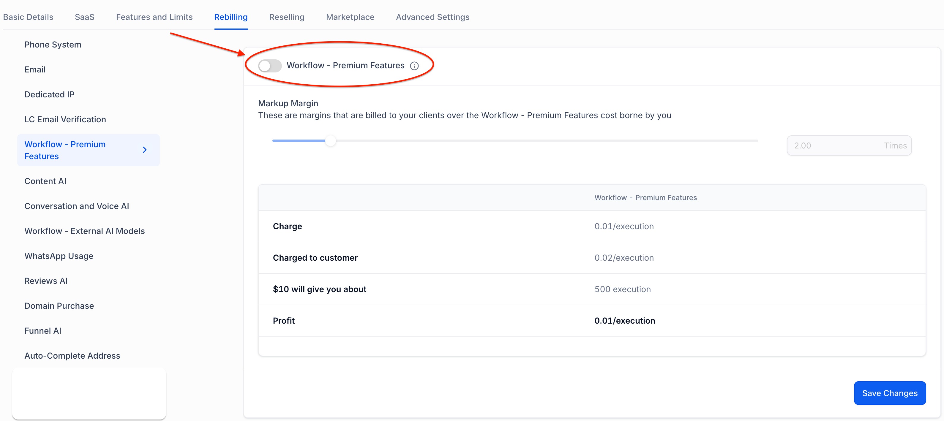 - In Agency account > Accounts tab > Scroll to the Sub-Account > Click the View Details link > Scroll to the Premium Features for Workflow Re-Sell Settings section and toggle it on.