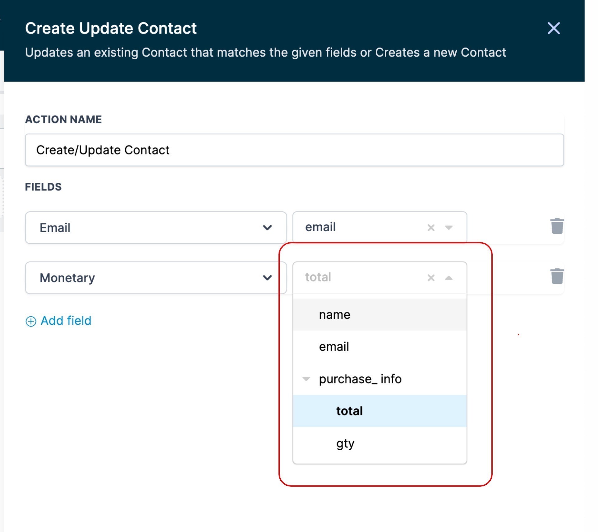 You will be directed to the "Create Update Contact" action after saving the trigger. "Create Update contact From there, you can select the necessary fields and map the incoming data you received from the trigger. Please note that to create a new contact or map data to an existing one, you must provide either an email or phone field. If your trigger data is not carrying email or phone you can remove this action from workflow and workflow will continue to execute contactless.