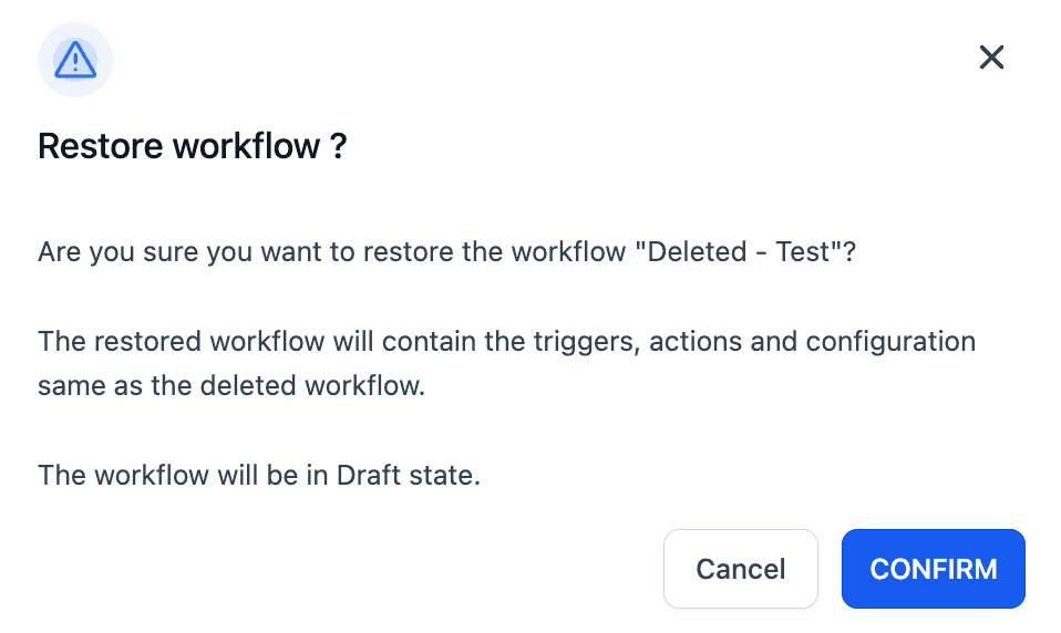 - The restored workflow will retain its original triggers and actions with the same configuration.