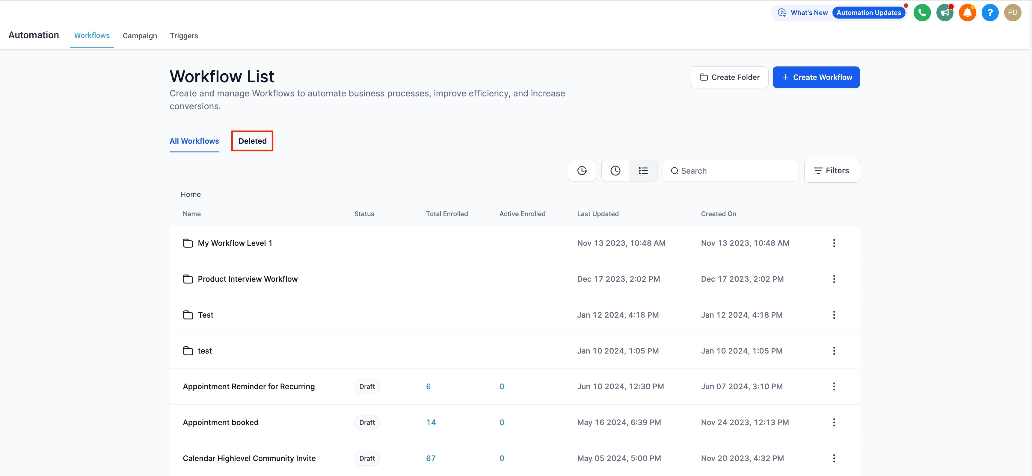 - A new tab named "Deleted" is added in the workflow list page.