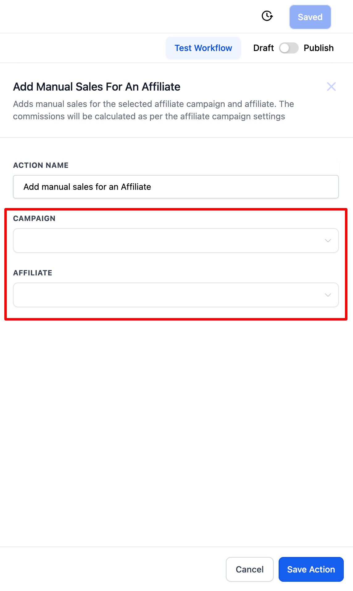 The "Add Manual Sales For An Affiliate" action in workflows empowers you to efficiently manage and assign manual sales for specific affiliates within selected campaigns. By automating this process, commissions are calculated according to the campaign's default settings, ensuring accurate and timely rewards for your affiliates. This feature is designed to streamline your workflow, enhance commission tracking, and provide greater flexibility in managing affiliate-driven sales.