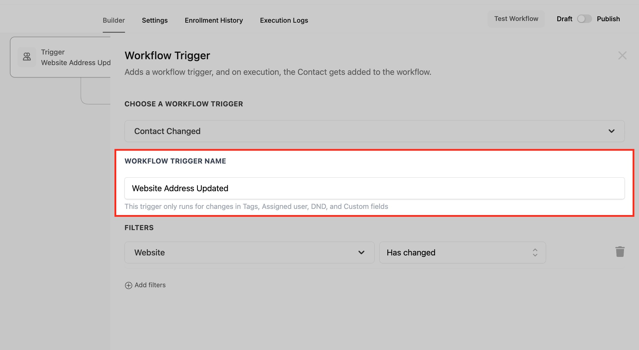 Yes! You can add multiple filters under the “Contact Changed” trigger to track different types of changes simultaneously. For example, you can configure the workflow to trigger when either a tag is added OR a custom field is updated, ensuring the automation responds to multiple events.