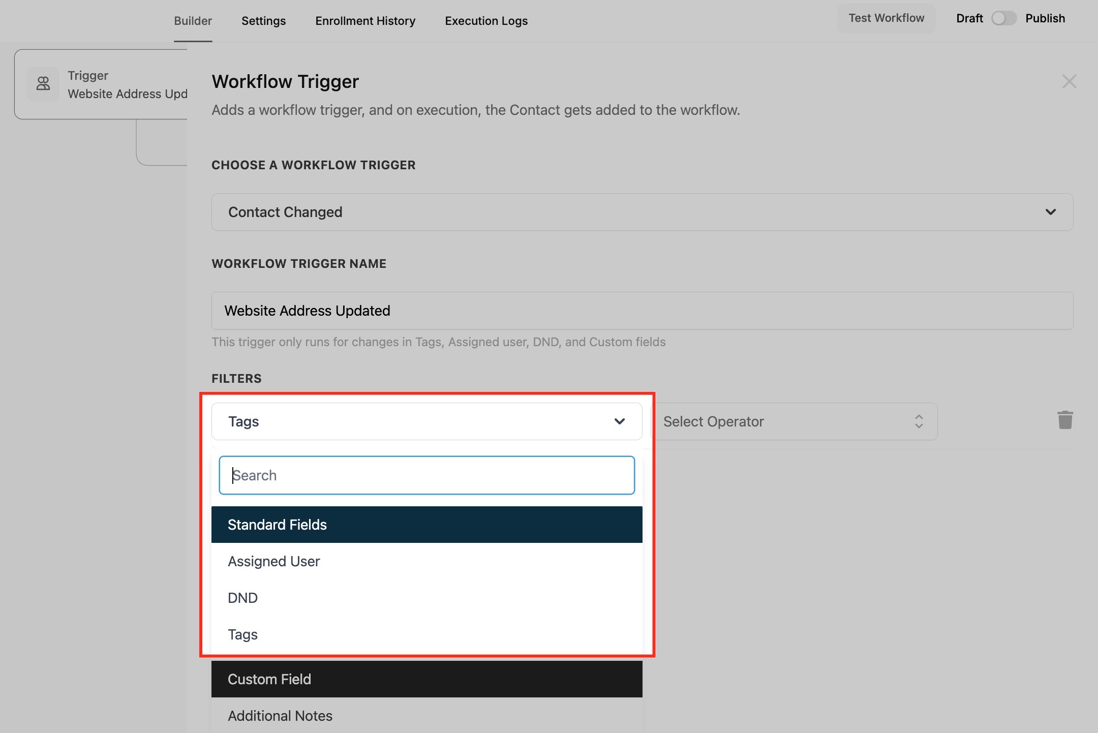 Decide what kind of contact changes will activate the trigger. Select Custom Field if you want to track changes in a specific field like “Website.” Choose Tags if you want the workflow to react to added or removed tags. Use DND if the workflow should respond to changes in the “Do Not Disturb” setting.