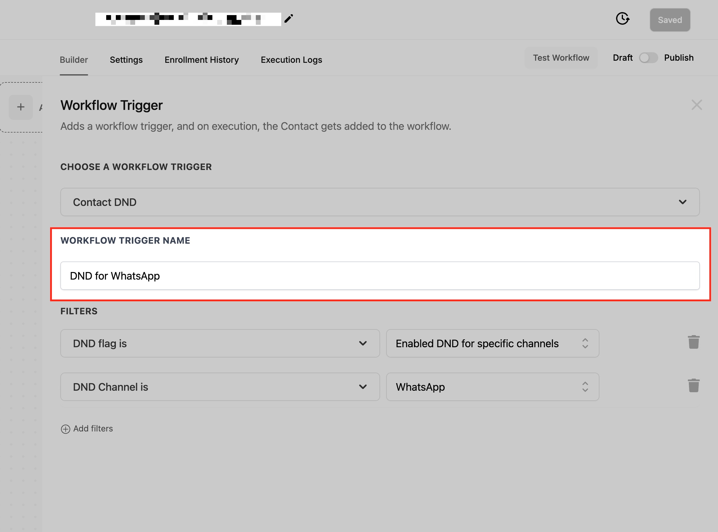Setting up filter ensures the workflow activates based on specific conditions related to a contact’s Do Not Disturb (DND) preferences. Here’s how you can configure each filter.