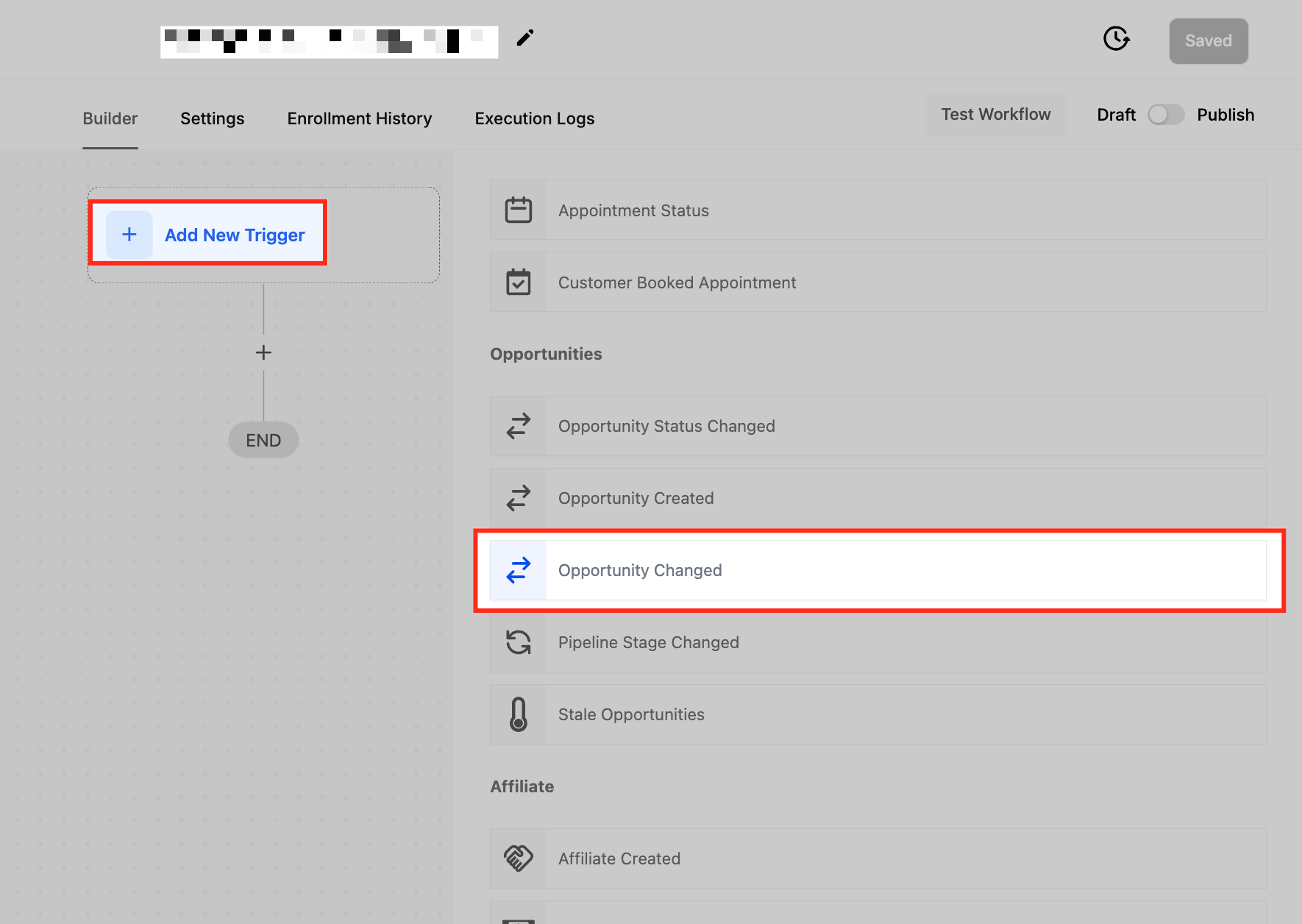 Click + Add New Trigger, then search for Opportunity Changed in the list of available triggers. Once found, select it to proceed with the configuration.