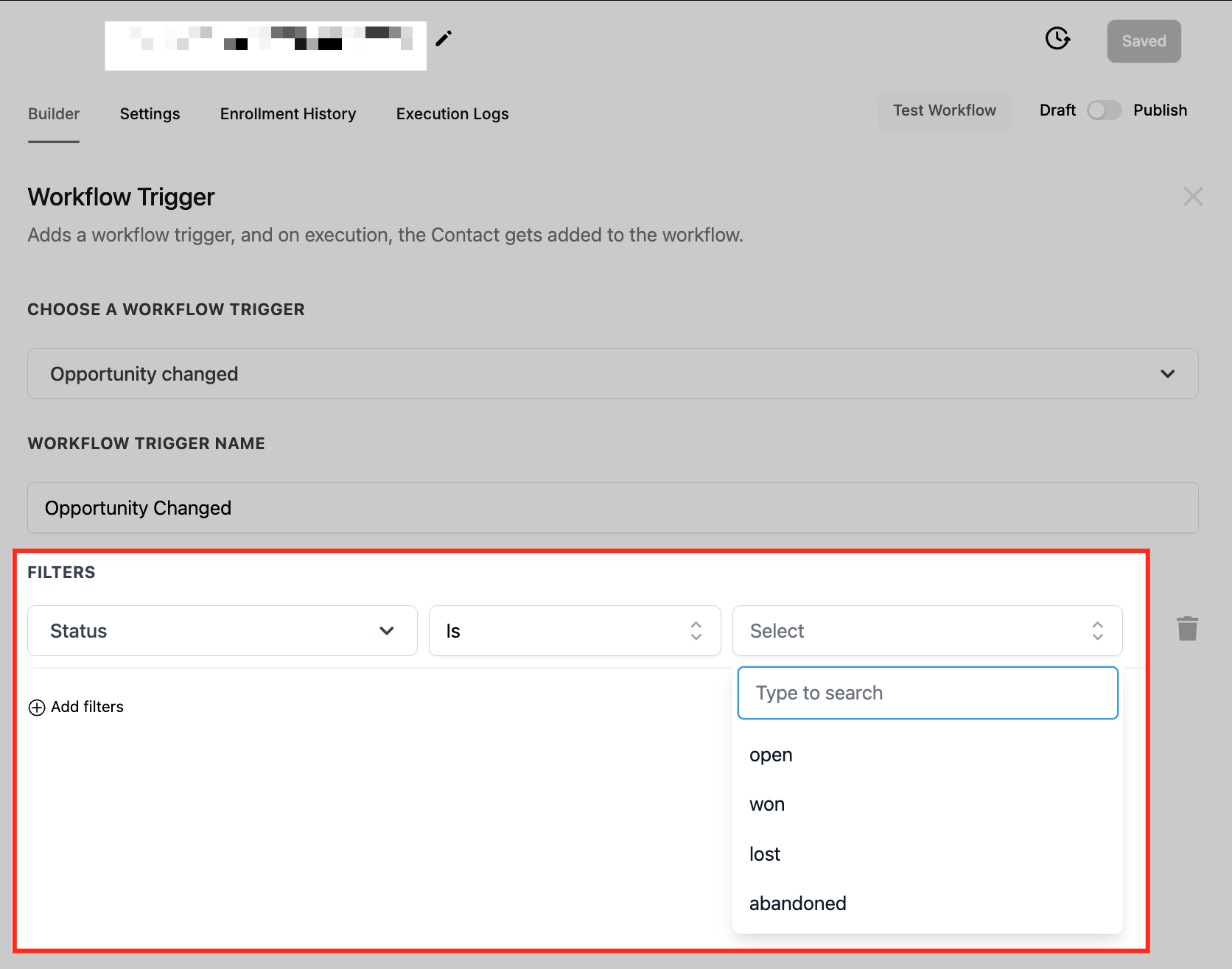 The Status filter allows workflows to trigger based on the current status of an opportunity. This ensures that actions are executed when an opportunity reaches a specific stage in the pipeline, helping teams track and manage their sales progress more efficiently.