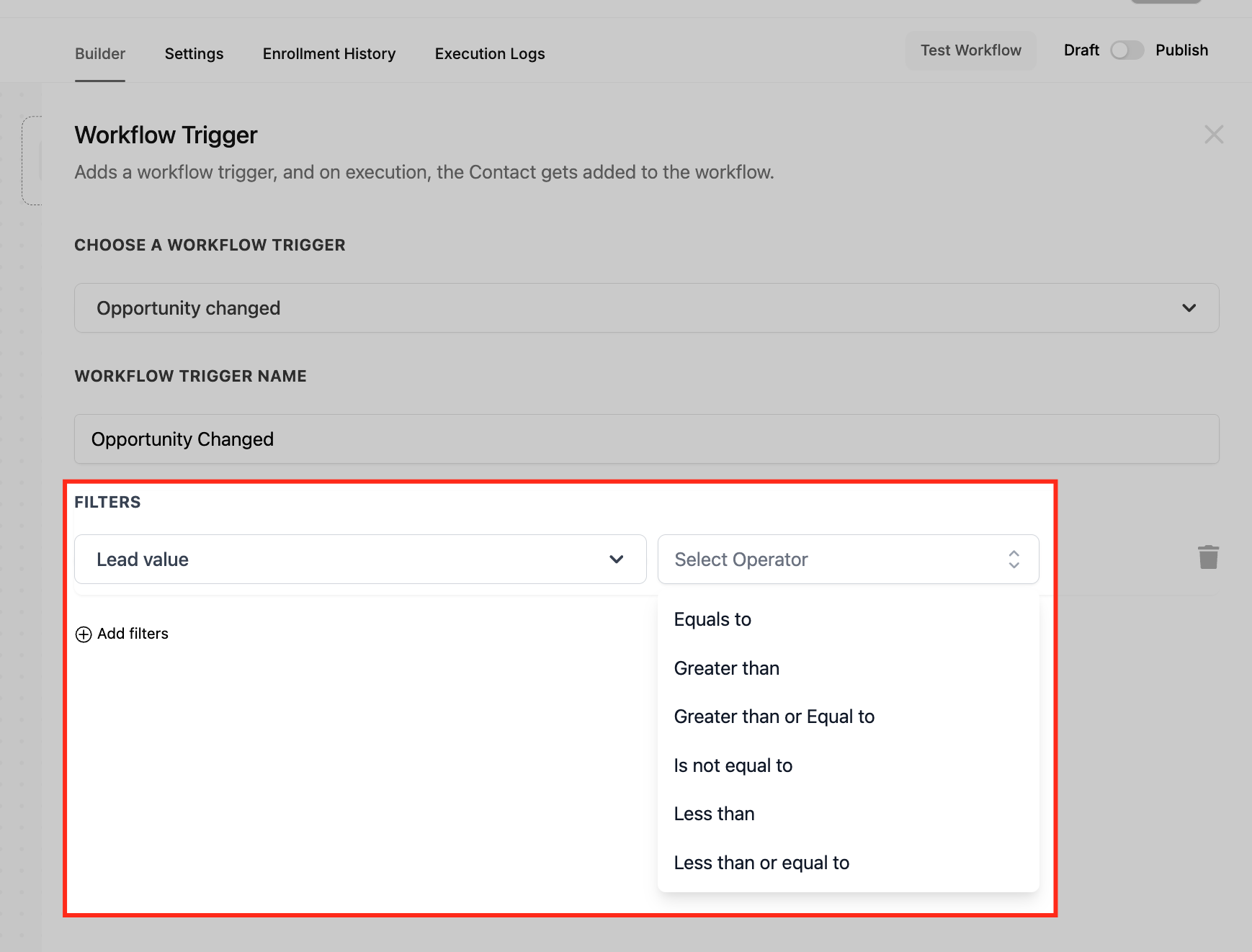 Filters help fine-tune your workflow so it only triggers when specific changes happen to an opportunity.
