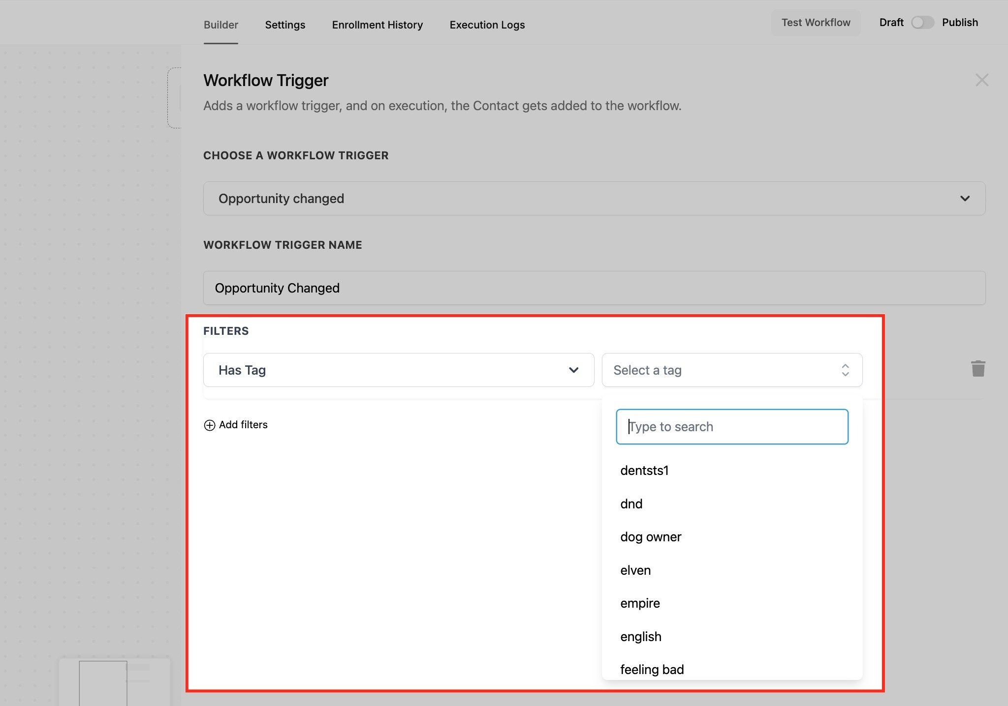 For example, if a tag like “Hot Lead” or “Follow-Up Needed” is applied to an opportunity, the workflow can be configured to send automated follow-up emails, notify sales reps, or move the lead to a different pipeline stage. This is especially useful for segmenting leads, prioritizing high-value opportunities, and triggering specific actions based on lead categorization.