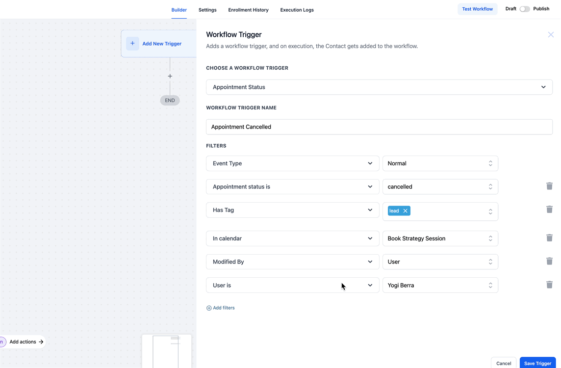 Yes, by selecting the “Appointment Status Is” filter and choosing 'Cancelled', for cancelled appointments. When you reschedule an appointment, it’s treated as a new one. The contact will re-enter the workflow from the beginning.