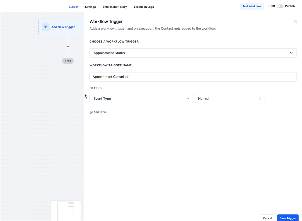 Once all filters are set, click Save to store the trigger configuration. Save and publish the workflow to activate automation. Test by booking an appointment and checking if the workflow executes as expected.