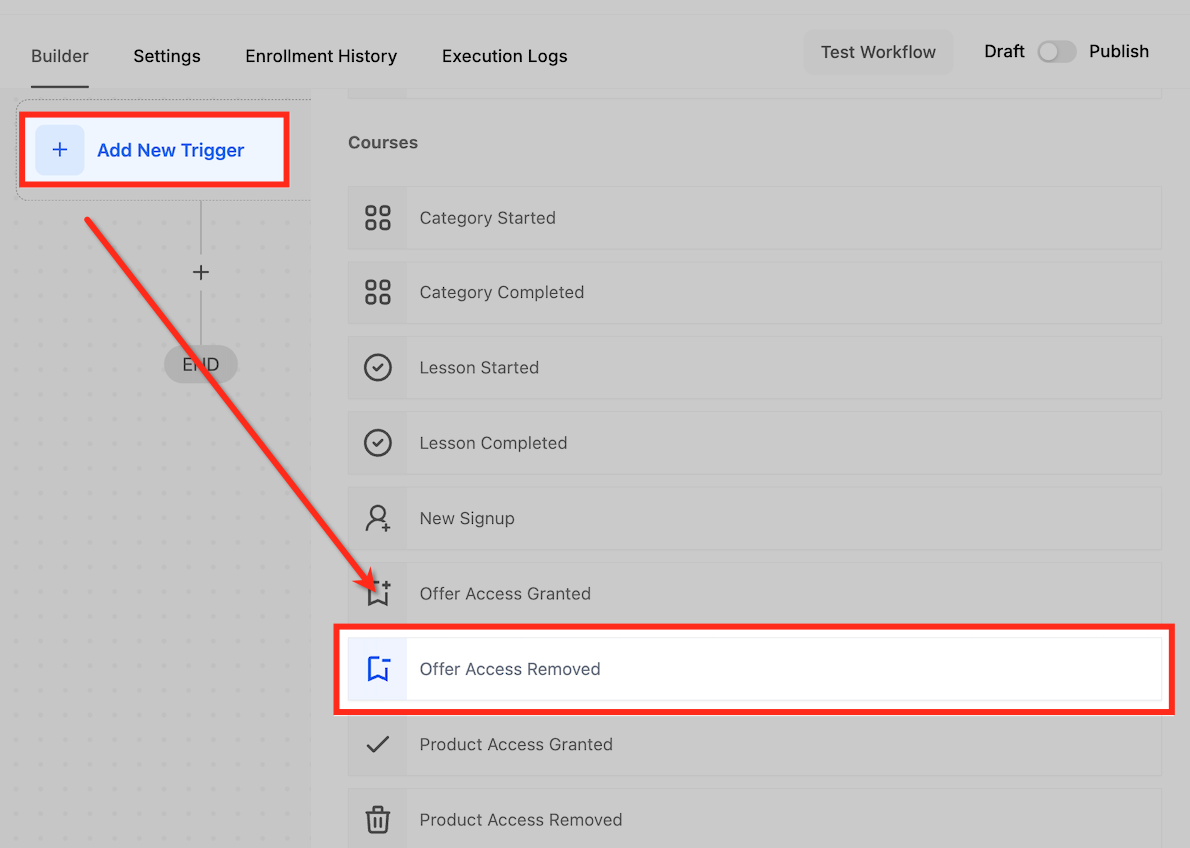 Click “+ Add New Trigger” and select "Offer Access Removed" from the dropdown menu.