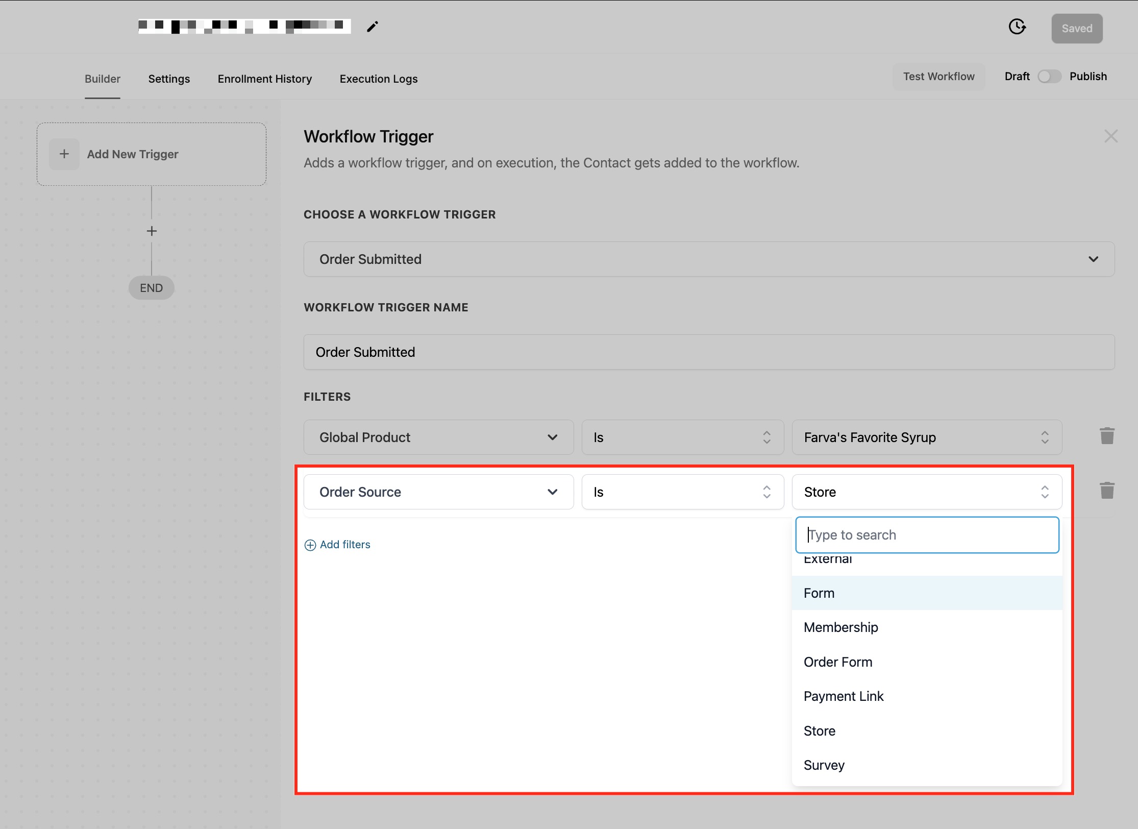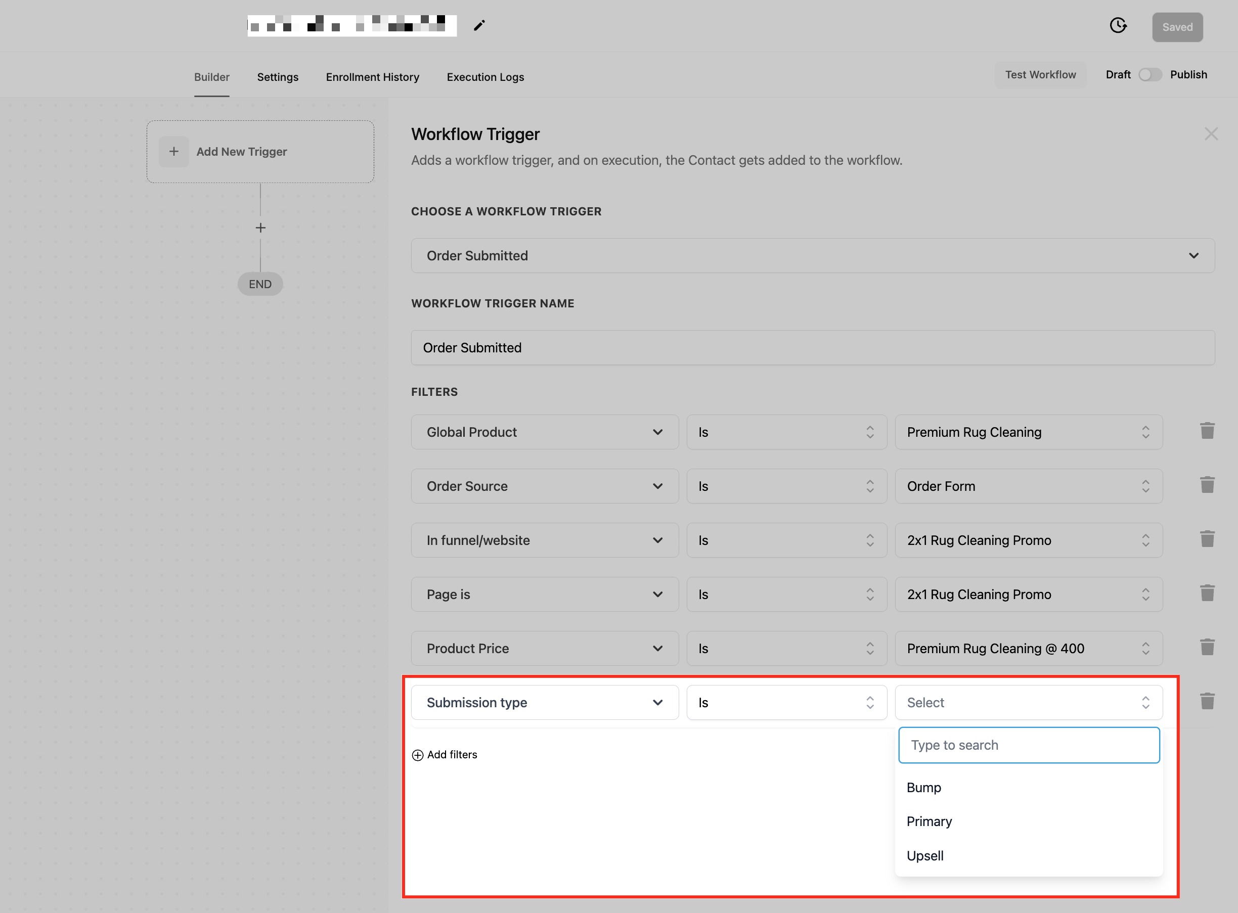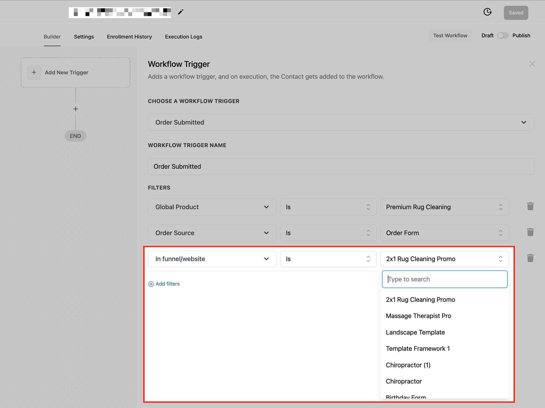 This filter ensures that workflows trigger only when an order form is submitted through a specific funnel or website, helping businesses refine automation based on the exact sales channel used. This is particularly useful for businesses that run multiple sales funnels or have different websites for various products or services.