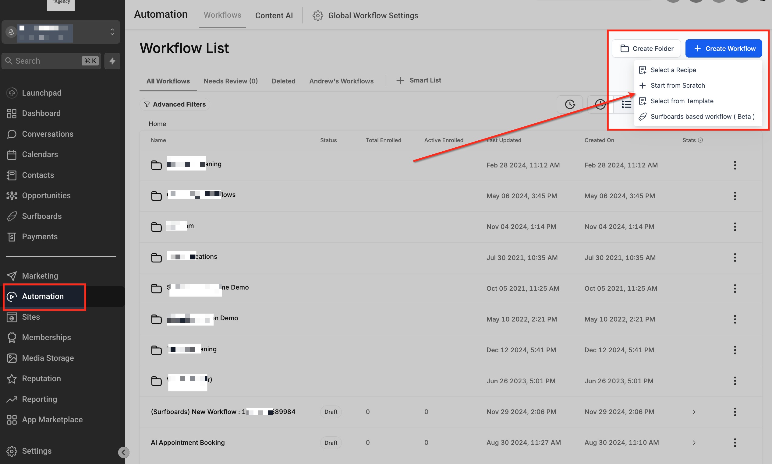 Navigate to the Automation tab and select Workflows. If you’re starting from scratch, click + Create Workflow to build a new automation. If you want to add this trigger to an existing workflow, simply find the workflow from the list and open it for editing.