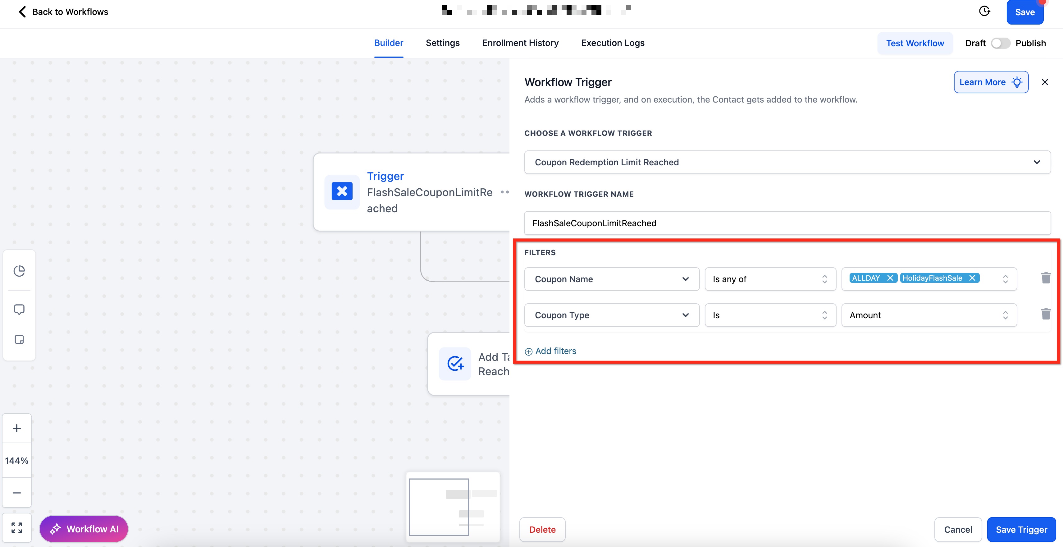 The workflow will trigger for any coupon hitting its redemption limit. To monitor specific campaigns, use filters like Coupon Code Is or Coupon Name Contains.