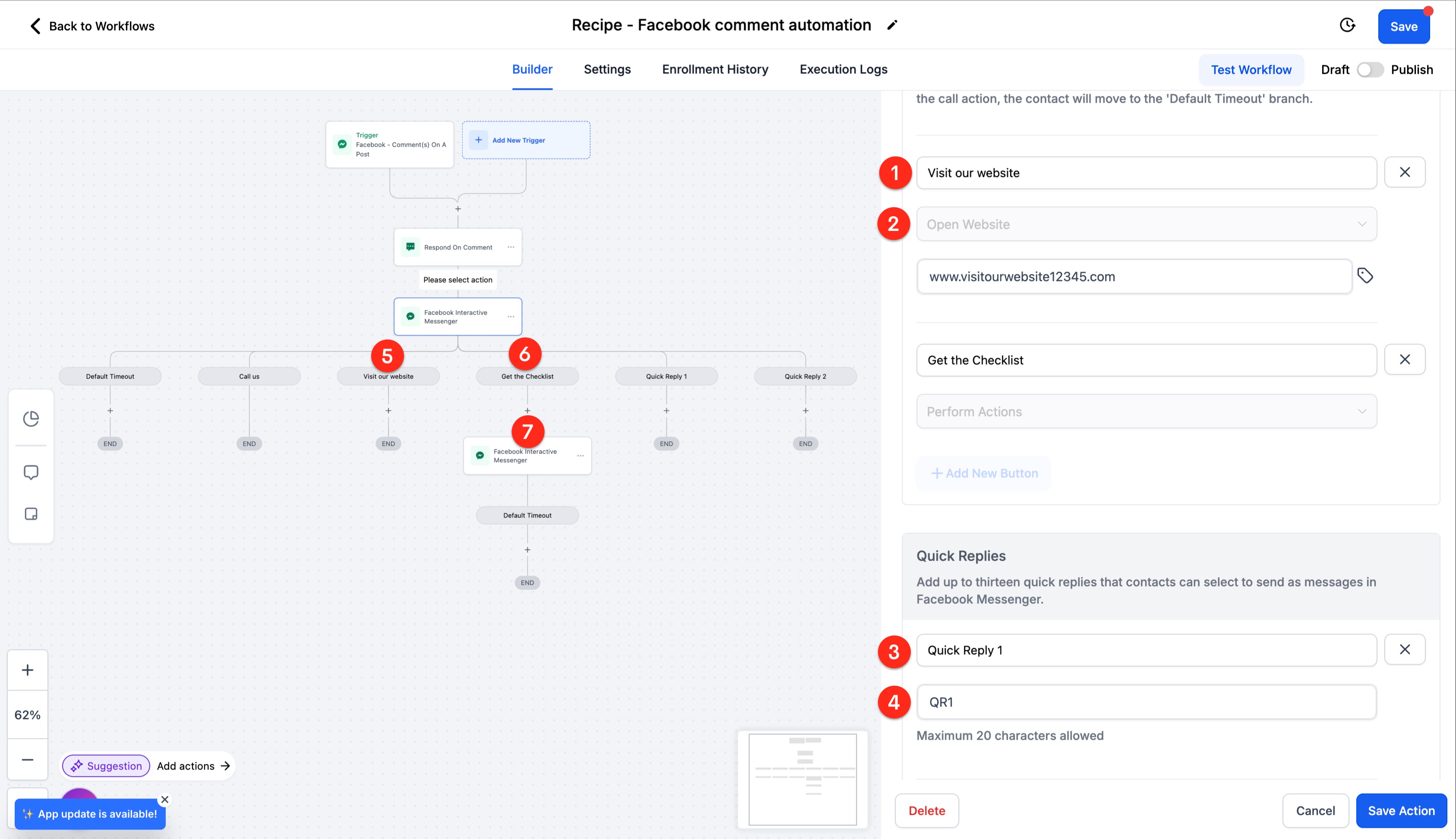 The Buttons and Quick Replies are a big part of what makes this action "interactive". You can guide the conversation down pre-defined paths.Buttons and quick replies both create the same branches in a workflow. However, they serve slightly different purposes.