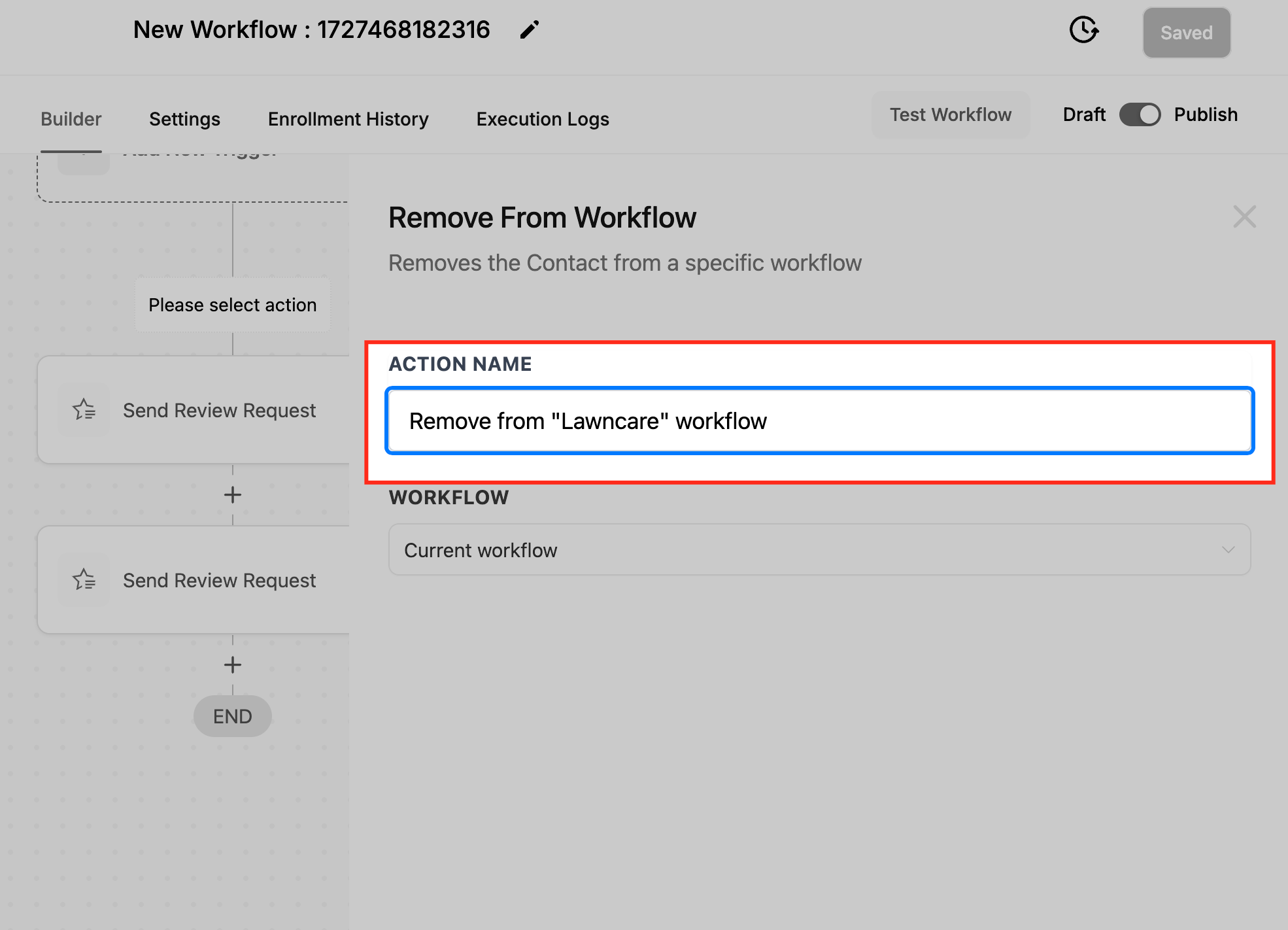 The “Remove from Workflow” action is a powerful tool for automating contact management in your workflows. It allows you to automatically remove contacts from one or multiple workflows based on specific triggers or conditions. By keeping your workflows clean and relevant, this action ensures that contacts receive the right communication at the right time, without being overwhelmed by redundant or irrelevant interactions.