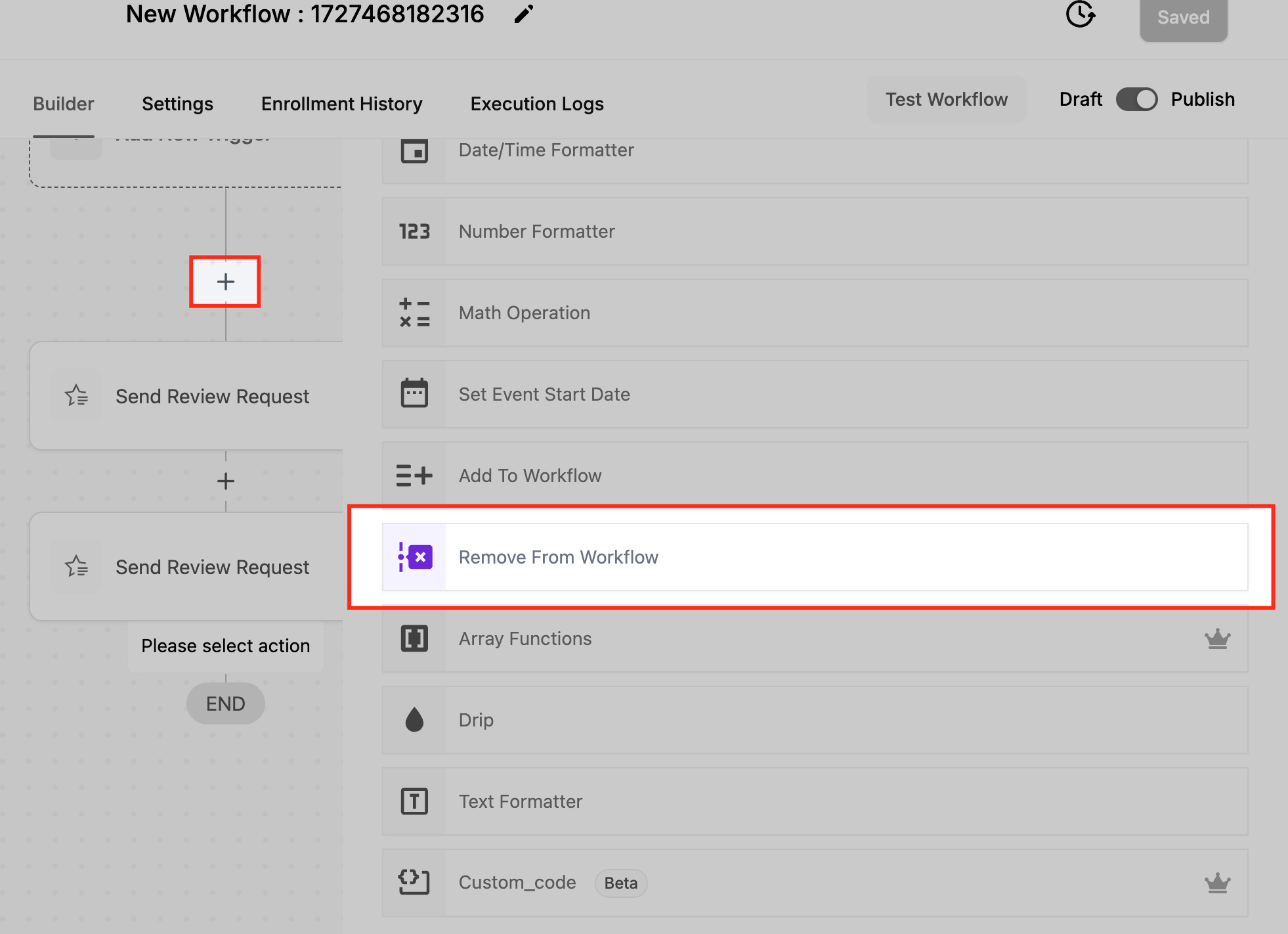 To view the list of all the workflow actions, Click "+" icon. When you see the list, scroll down to find "Remove from Workflow" action. Click there to configure the settings.
