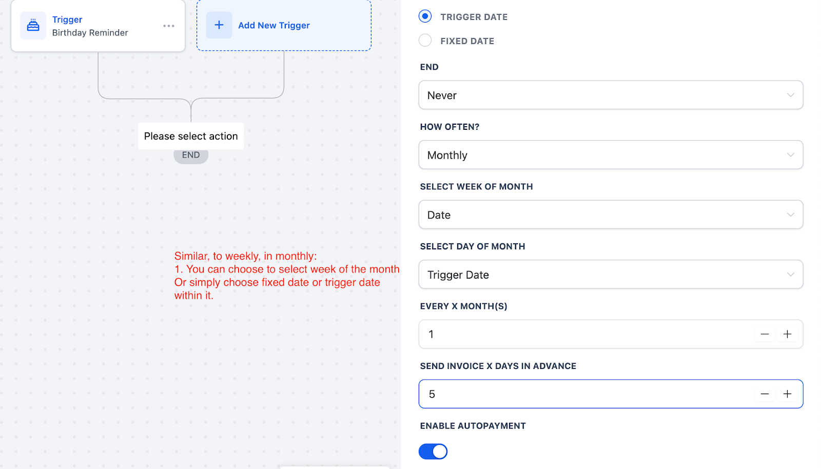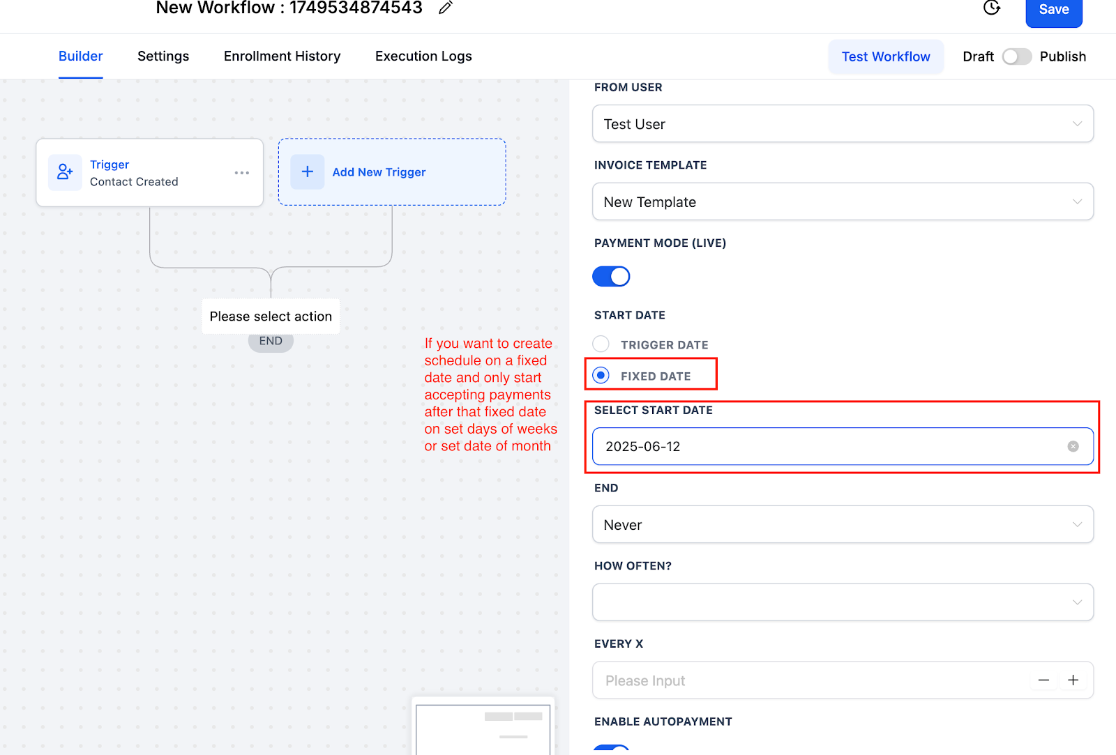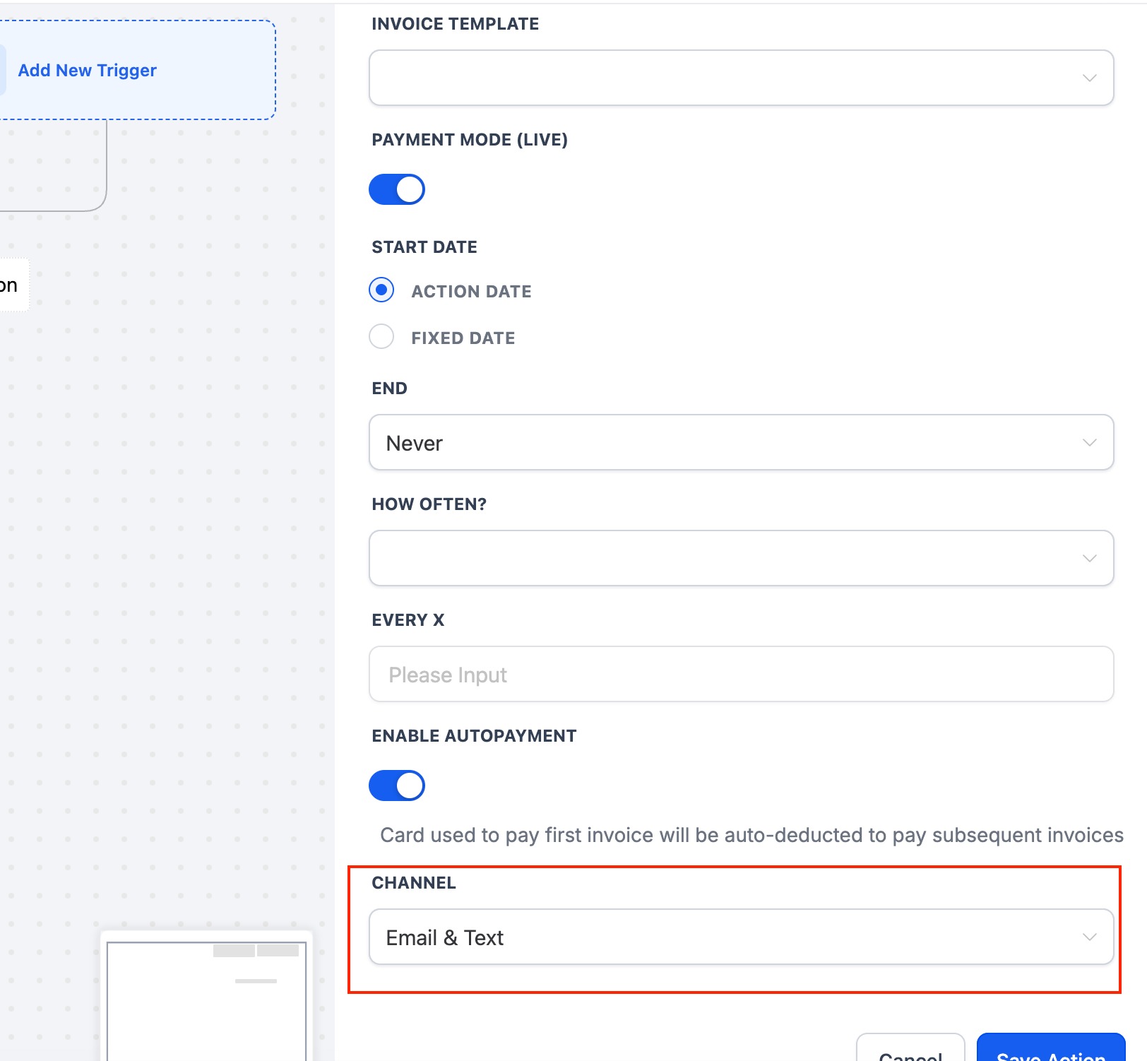 Below is a step-by-step guide —to configure every detail, including Action Date behavior, start/stop rules, frequency, and auto-payment.
