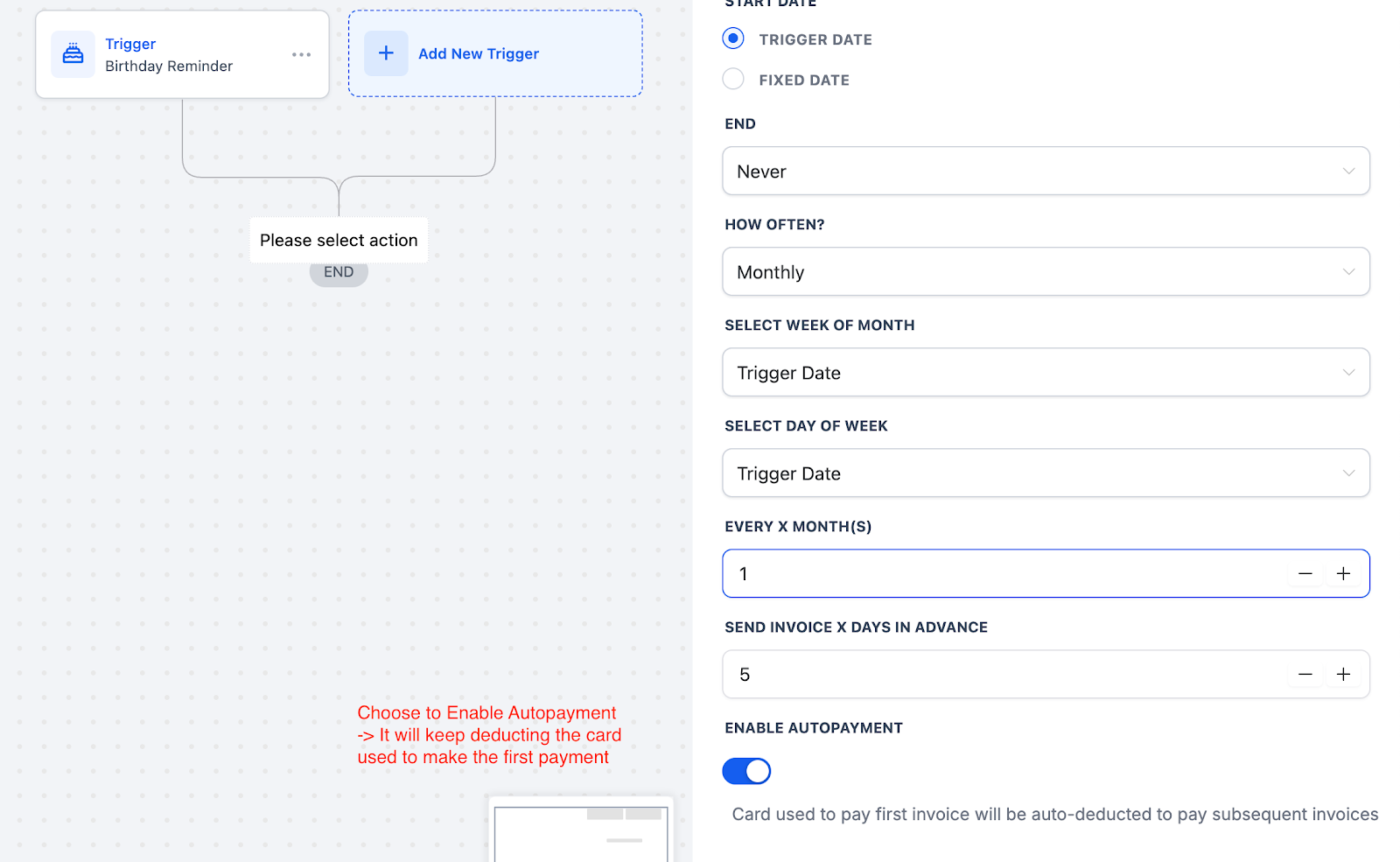 Use When: You want each contact’s billing cadence tied to their trigger event (e.g. user signs up on June 5 → bills on the 5th of each subsequent month).