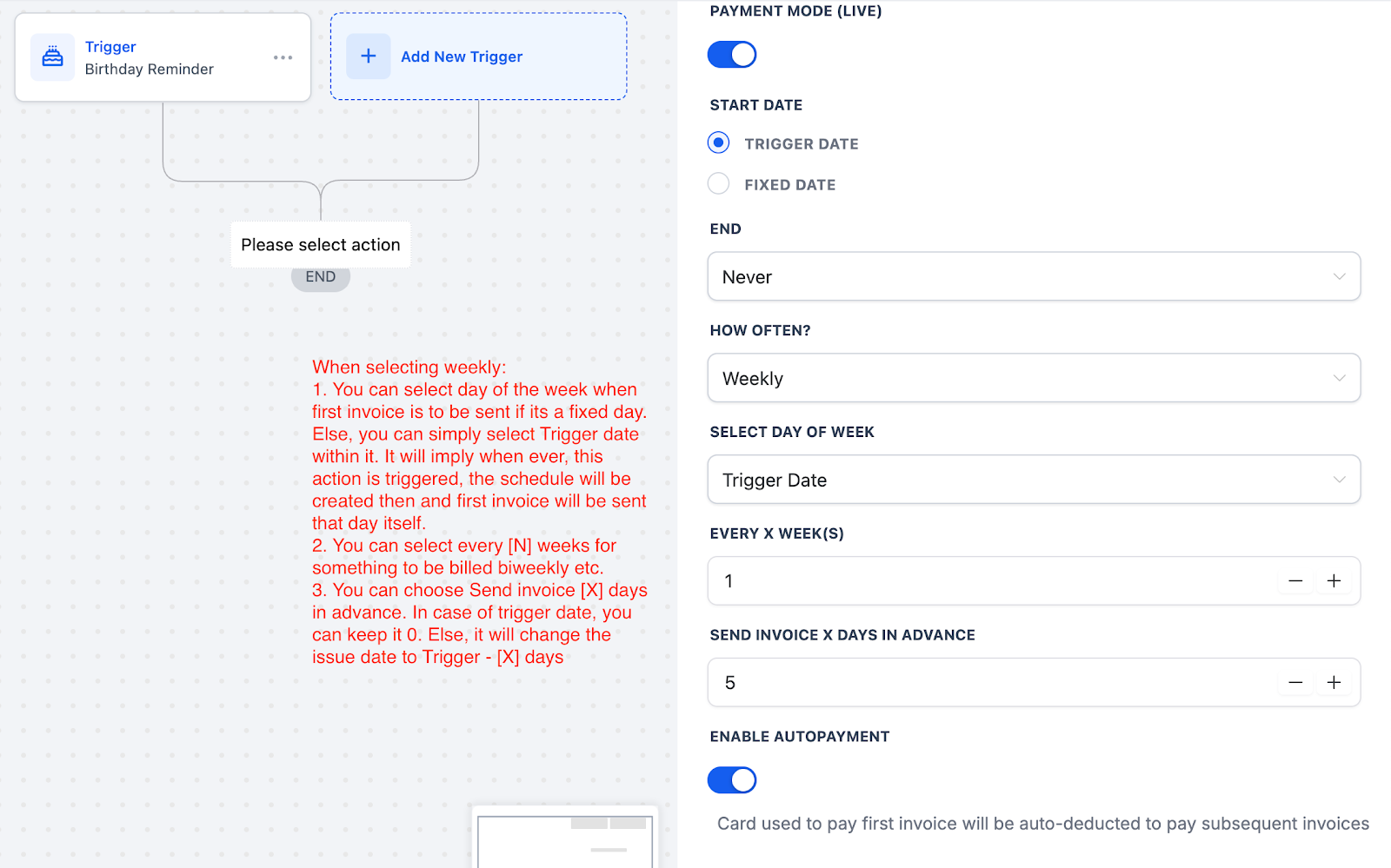 Action Date → the weekday of the trigger (e.g. if enrolled on a Tuesday → bills every Tuesday).