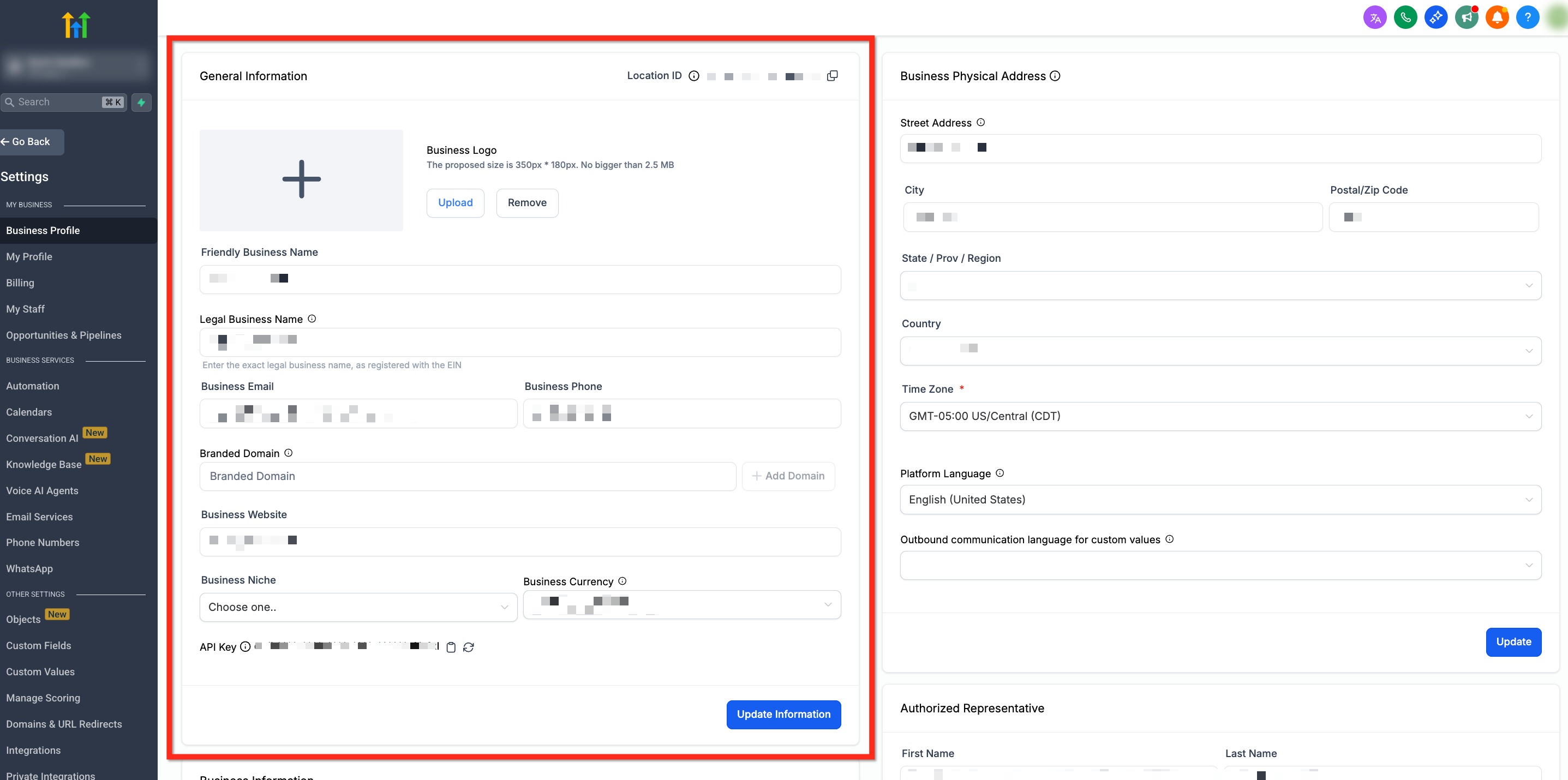 General Information covers your brand identity and key account properties. Set your logo, business names, contact email/phone, branded system-generated links (API domain), business website, niche, and API key so downstream features use accurate, on-brand data.