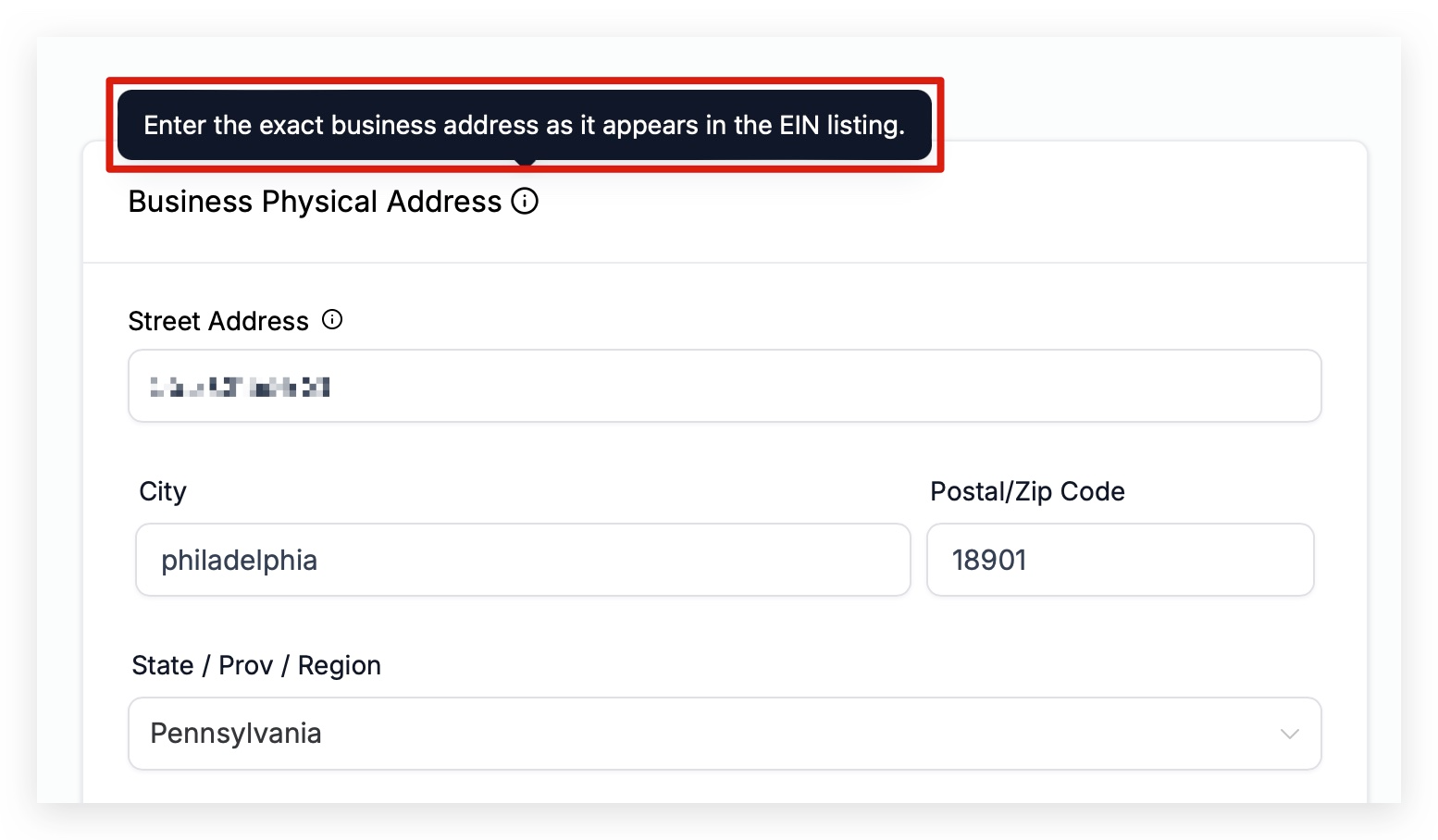 The Business Physical Address should match the address on your EIN listing. This information may be used to verify your business if needed.