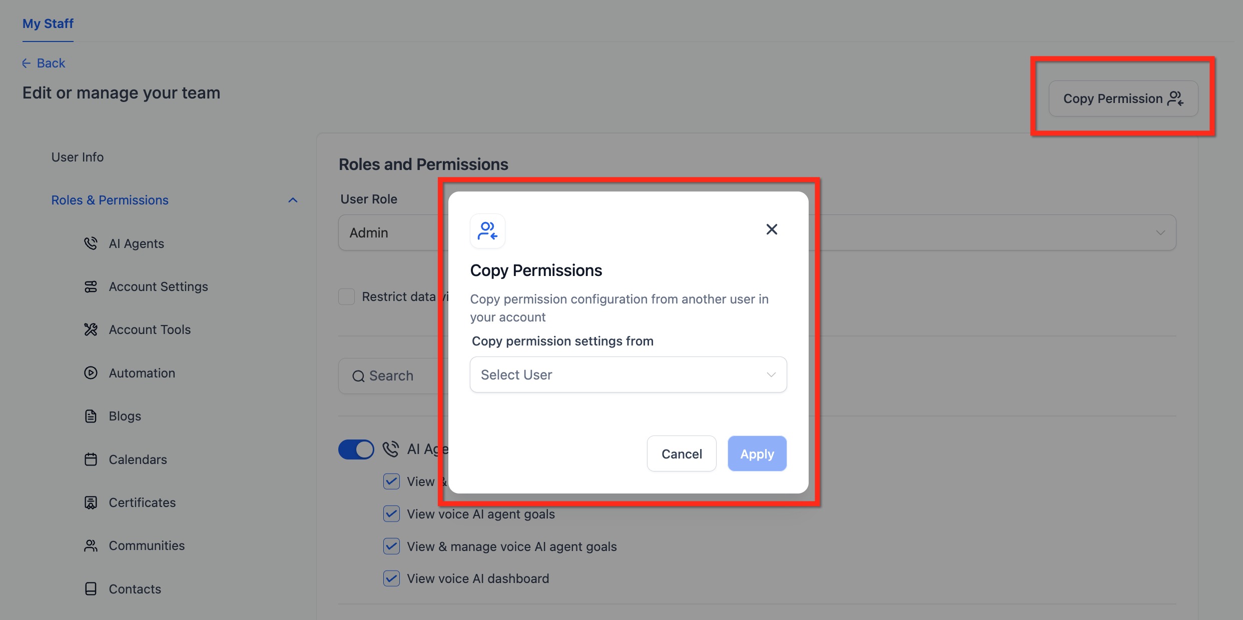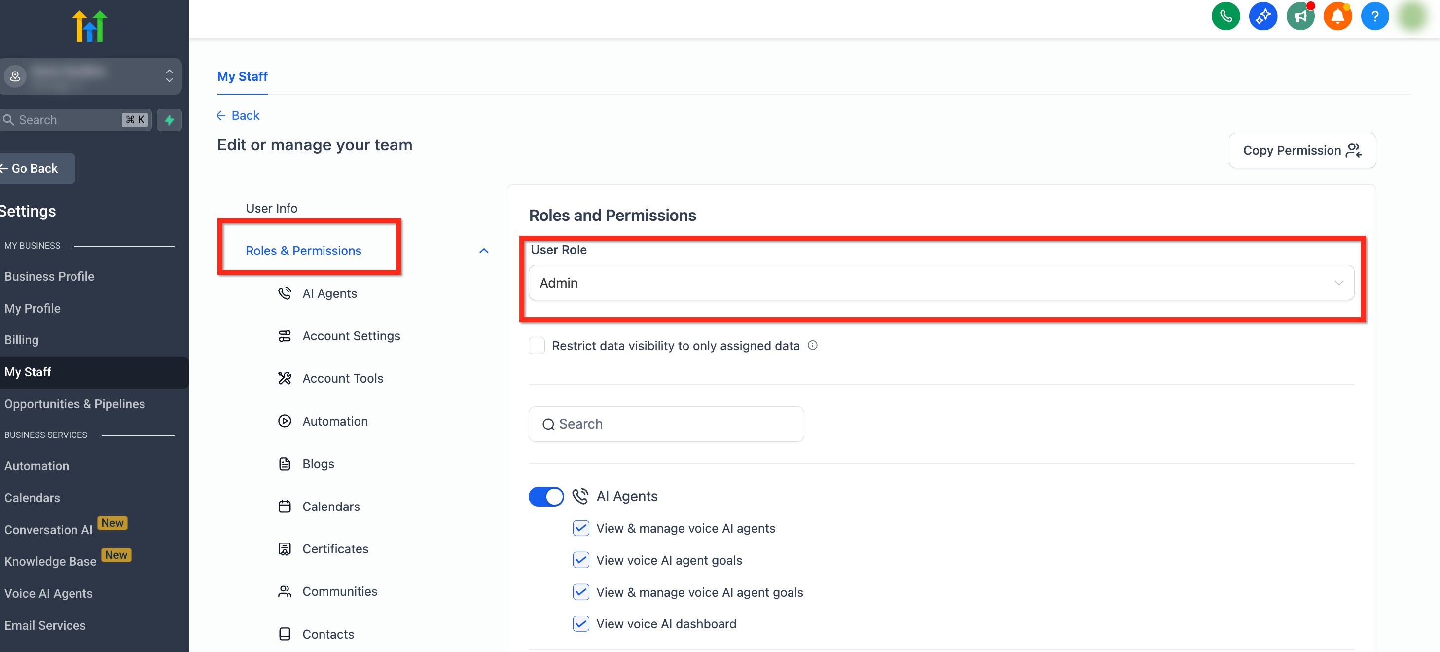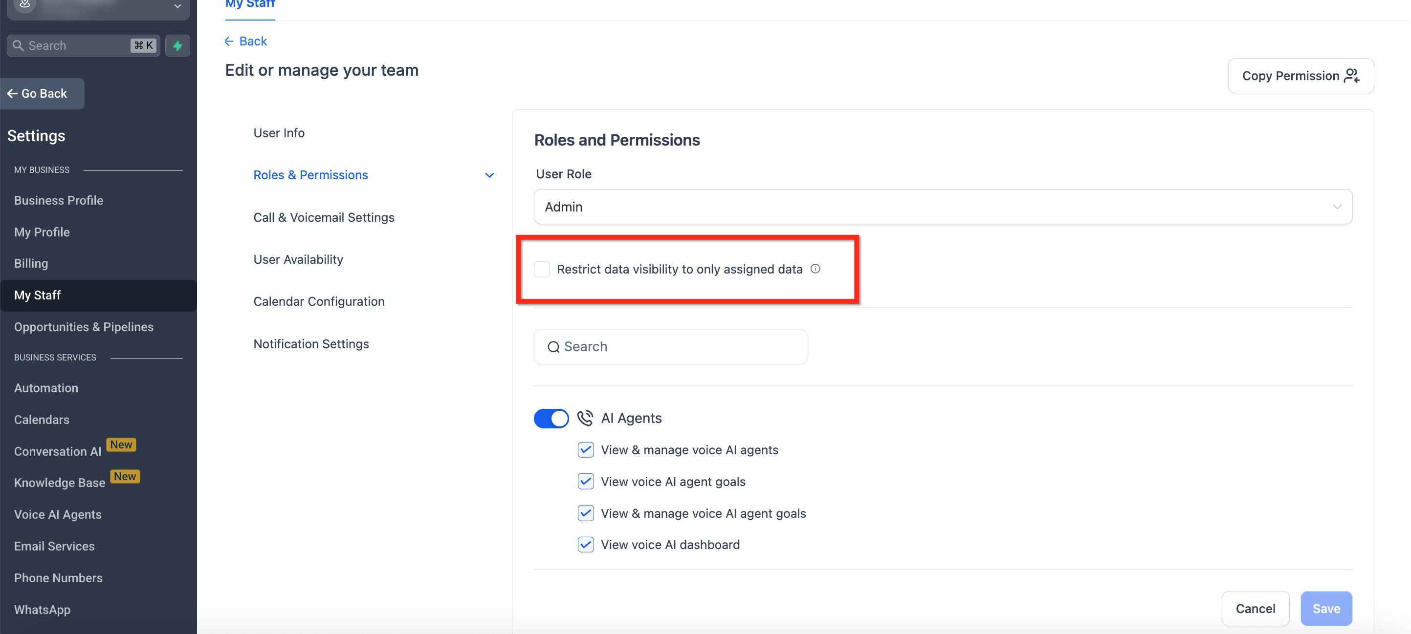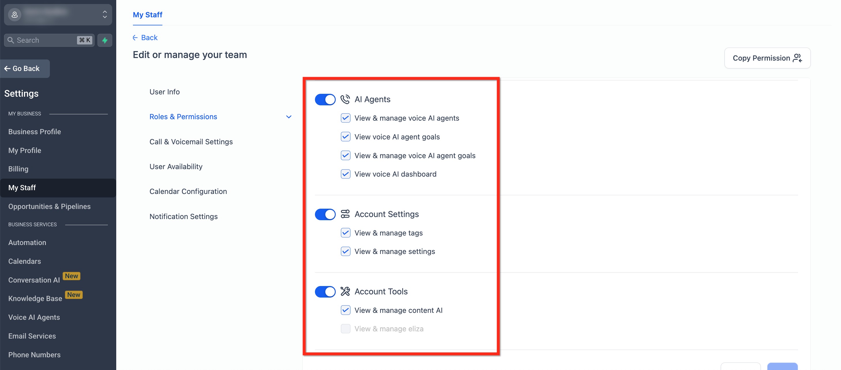 Use the checkboxes to grant or restrict access to modules like Conversations, Workflows, Calendars, Voice AI, etc.