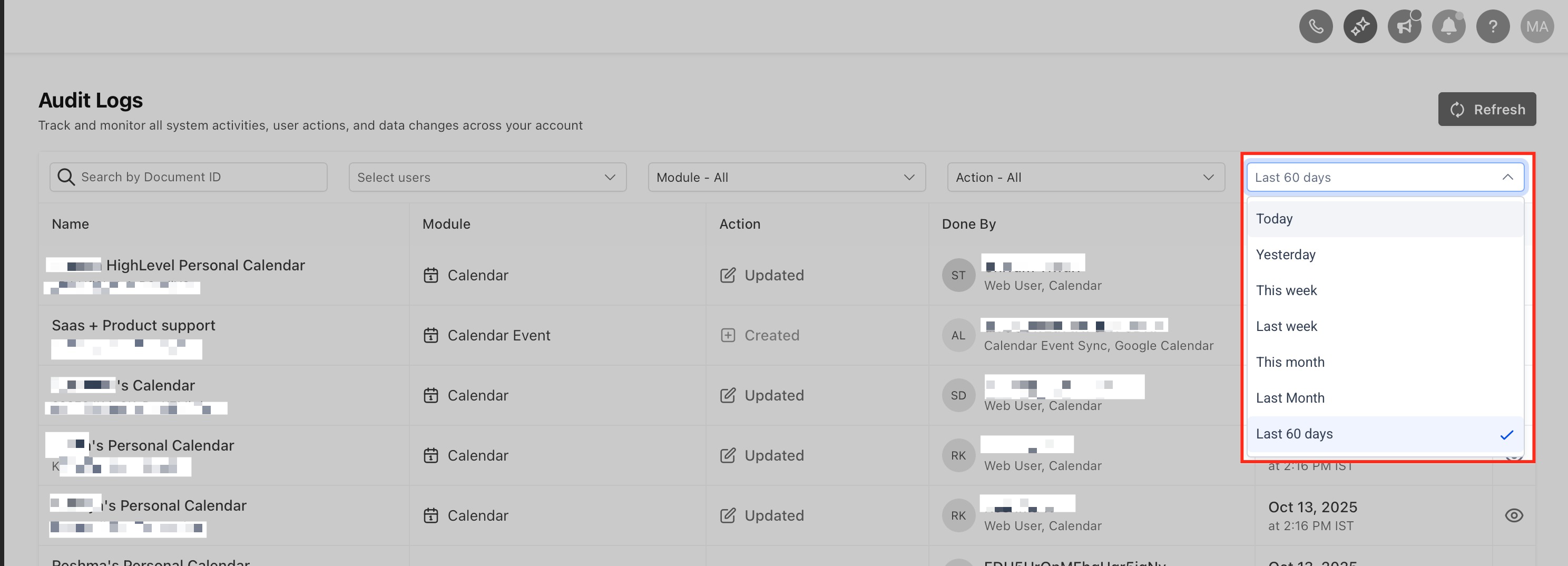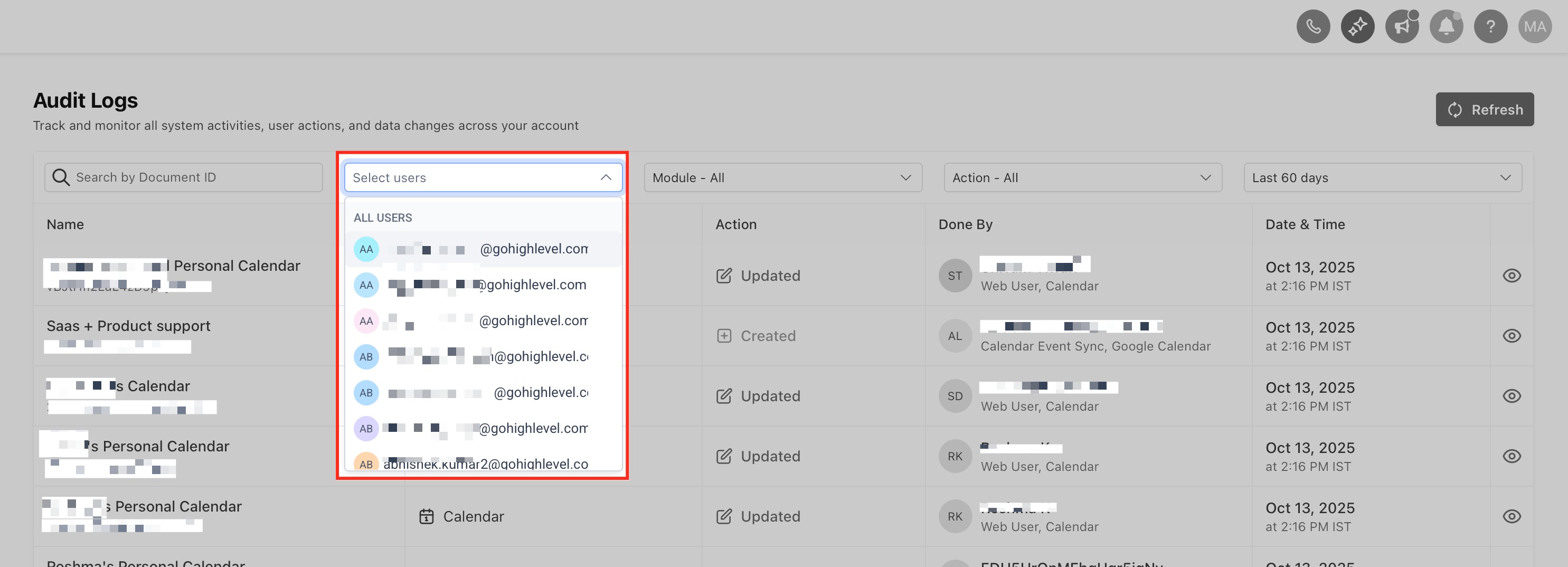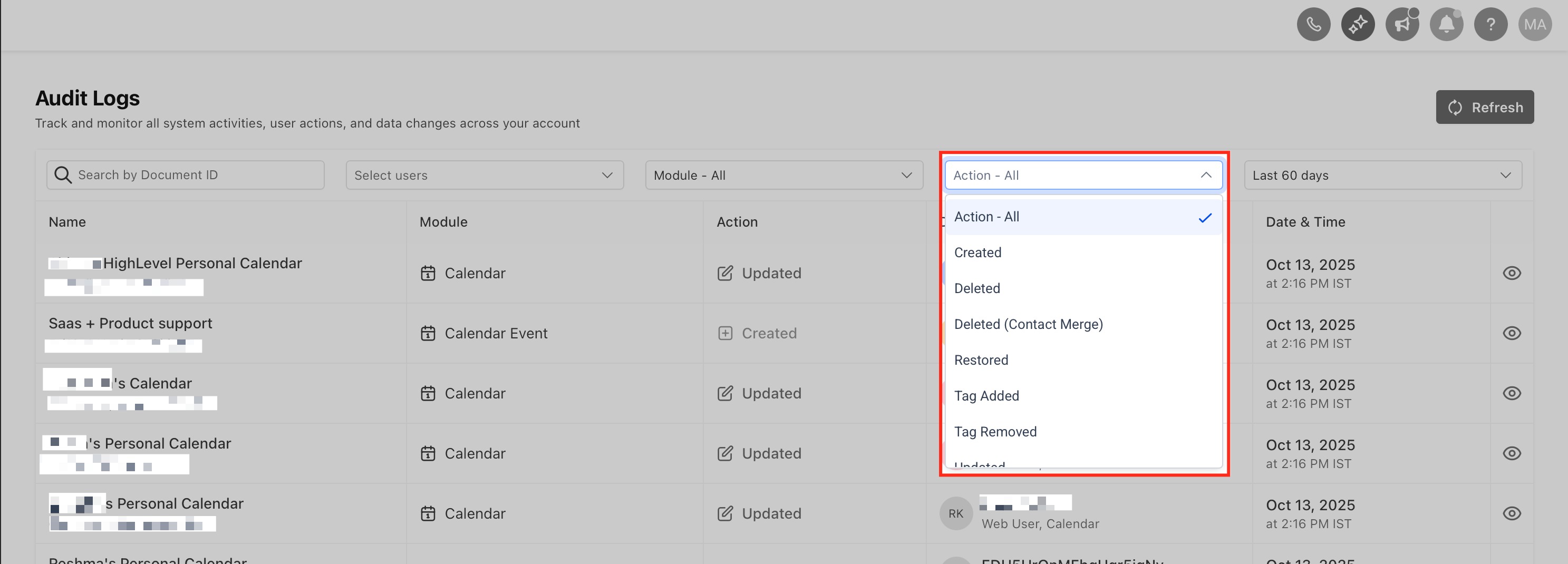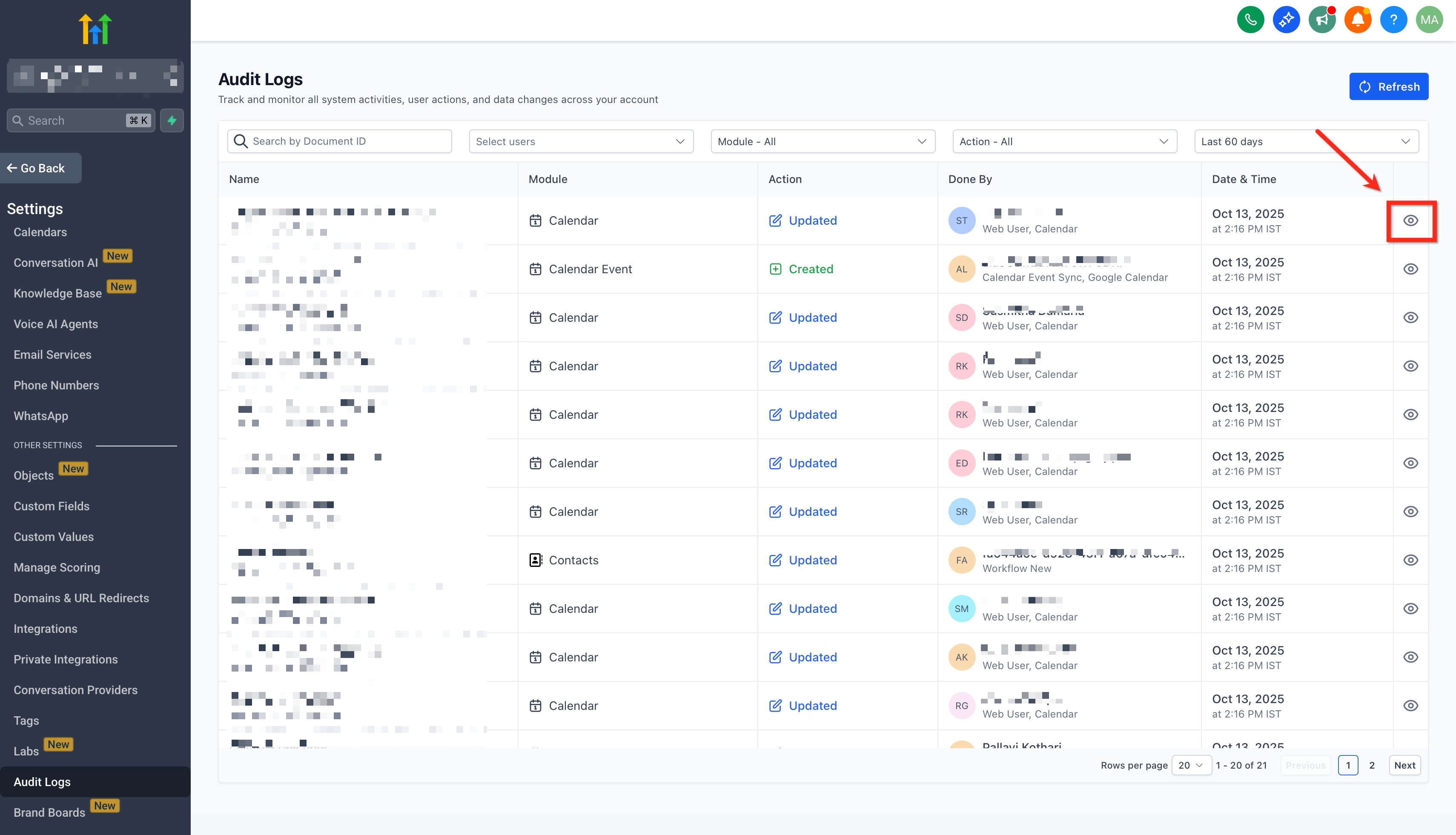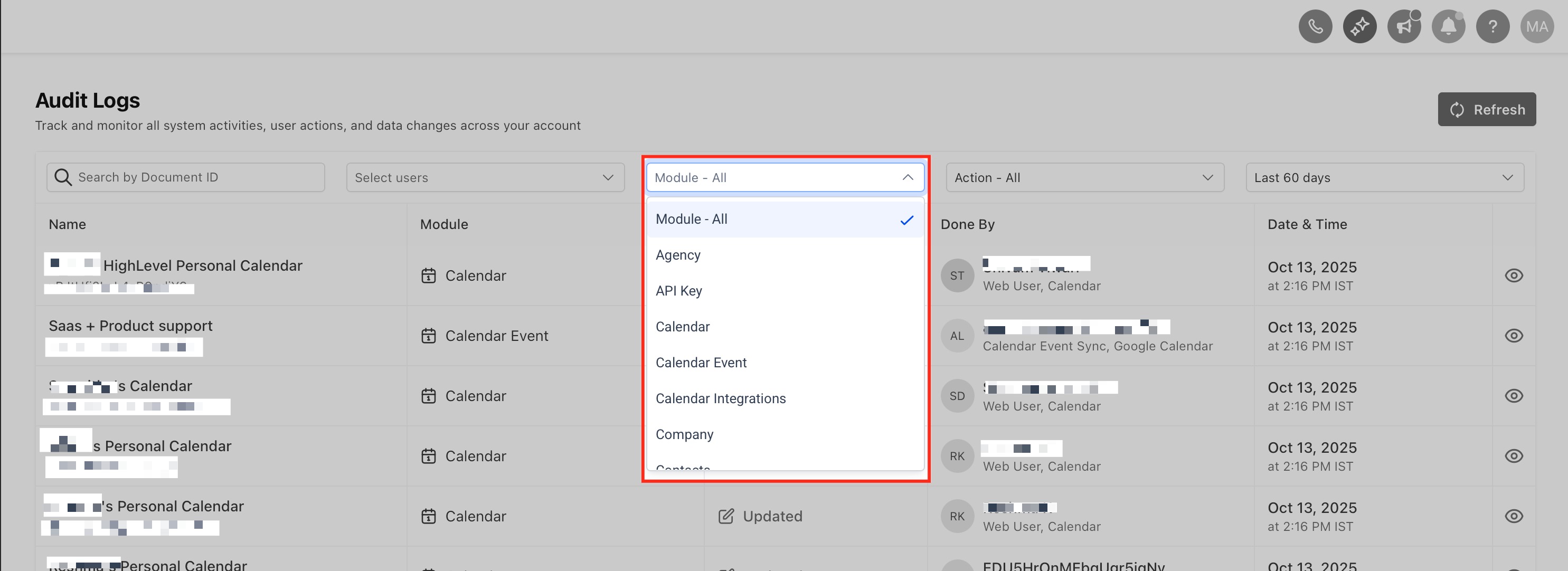 Audit Logs provide a time-stamped record of key actions taken in your HighLevel account, enabling transparency and traceability for admins and power users. The updated interface delivers the same insights in a cleaner, faster workflow consistent with other New Design System screens.