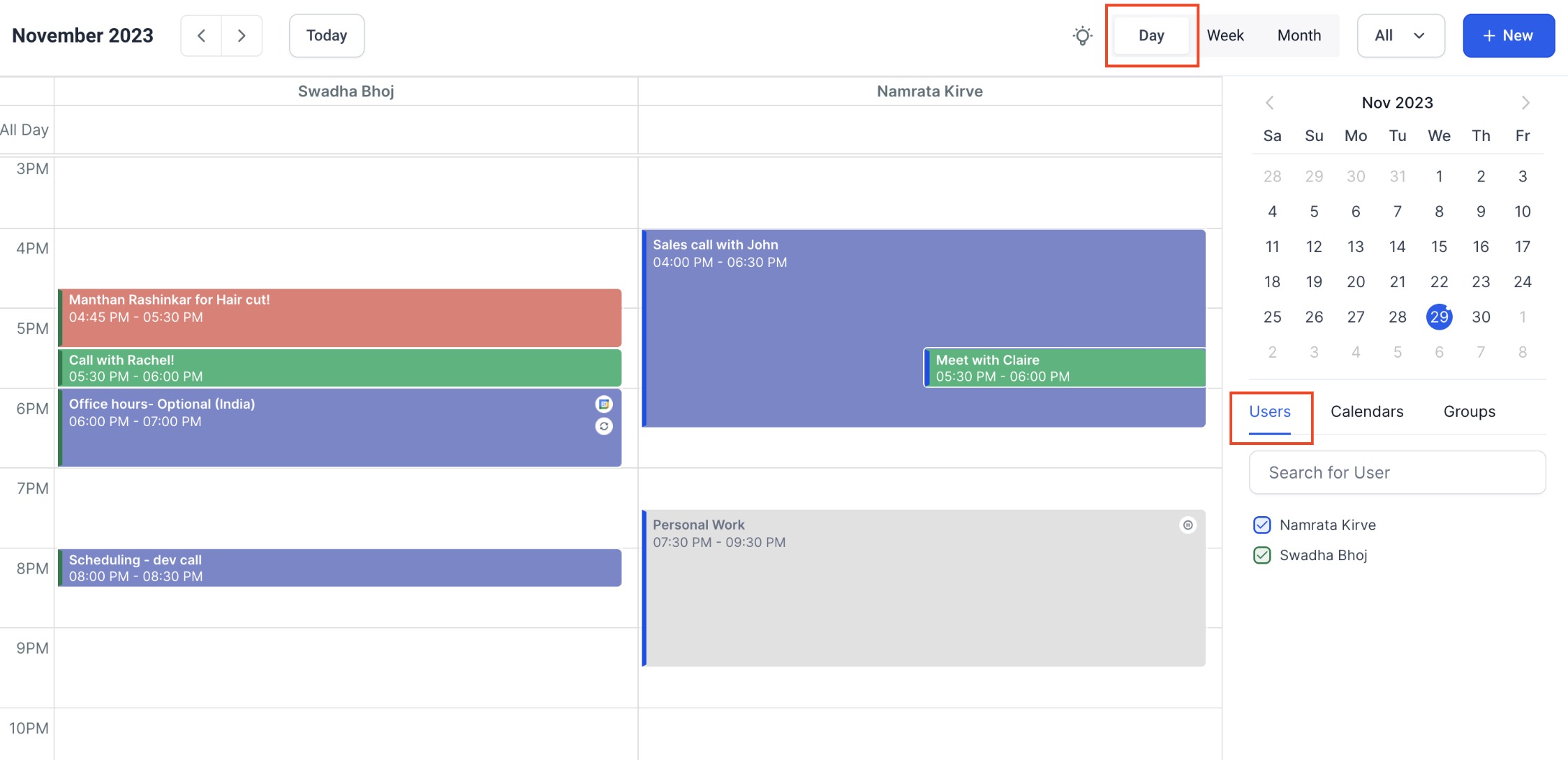 For example, in the user's Day view, a horizontal list of users will be presented, each with their individual day calendar below their respective names. This empowers users to efficiently identify available time slots and seamlessly compare daily schedules.