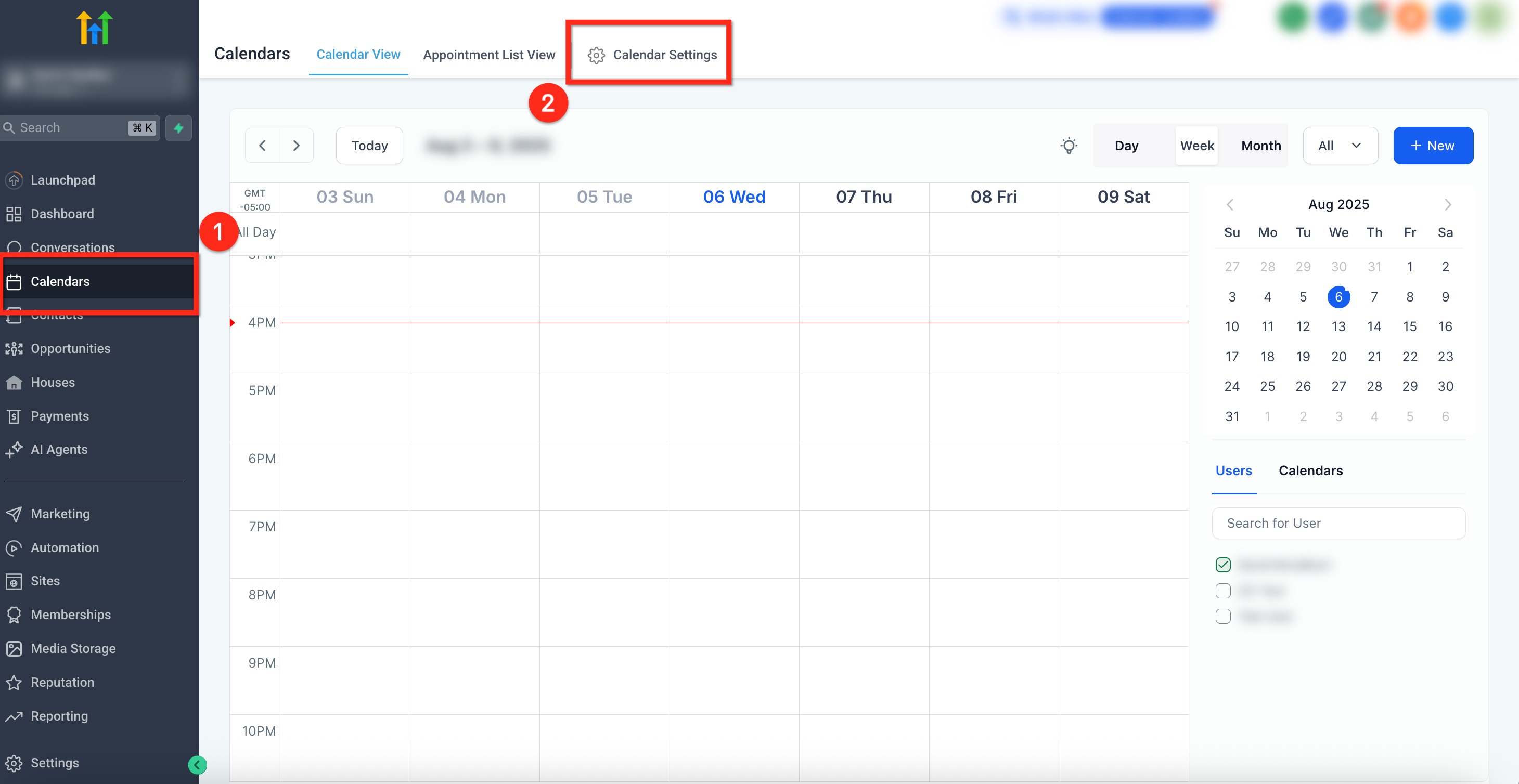 - From the sub-account dashboard, select Calendars on the left-hand navigation bar