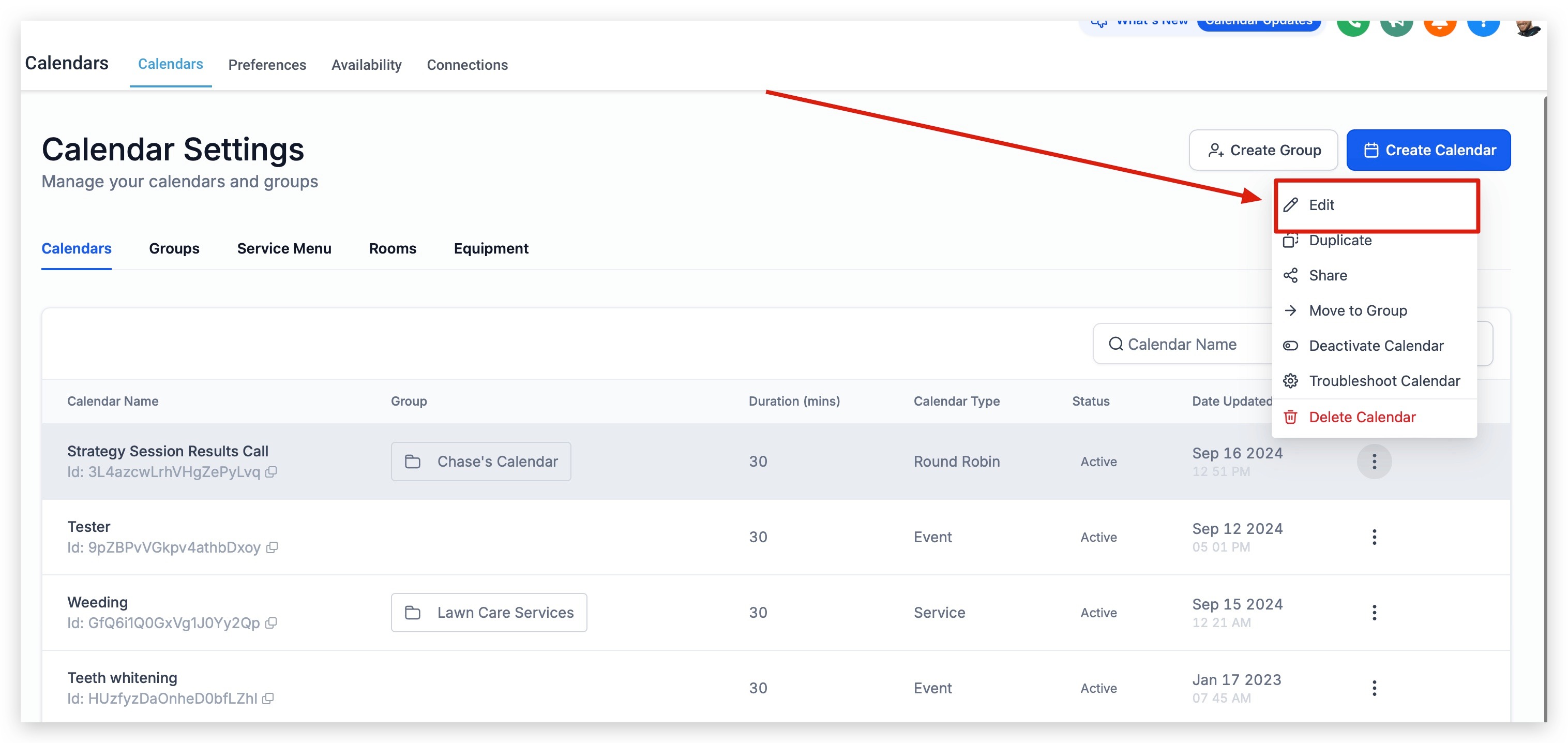 You can edit the Service Calendar you created by clicking on the three dots next to it and by choosing Edit from the options.