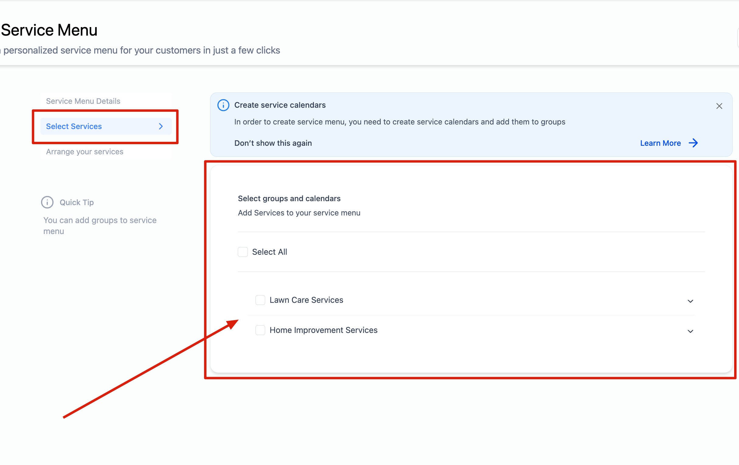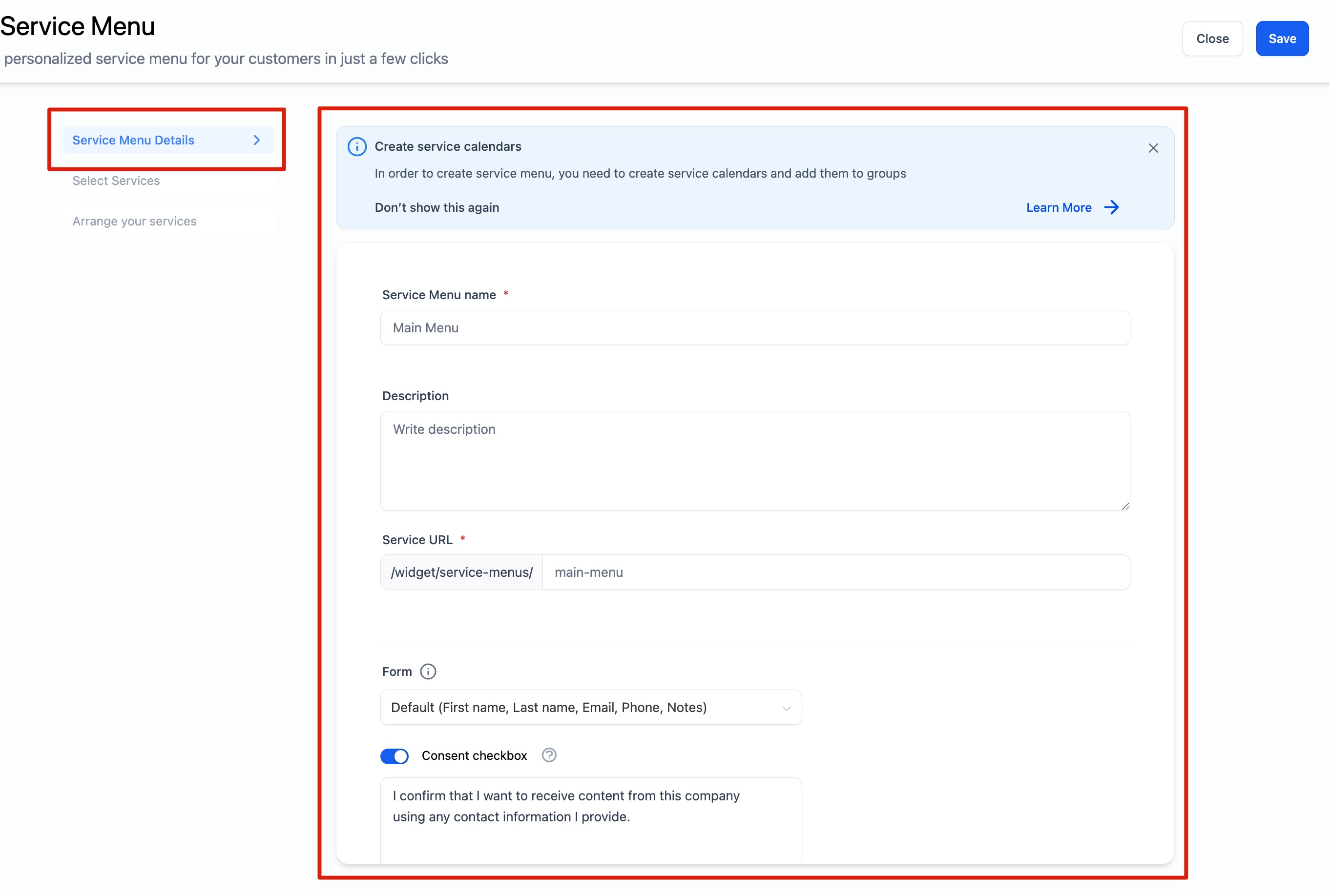 In order to start working on creating Service Menus and Service Calendars, you need to activate it from the "Account Preferences" in Calendar Settings. Once you've toggled the button to activate the Service Menu, scroll down and click on "Save Preferences" to save your changes. A new tab named "Service Menu" will now appear right next to Calendars and Groups.