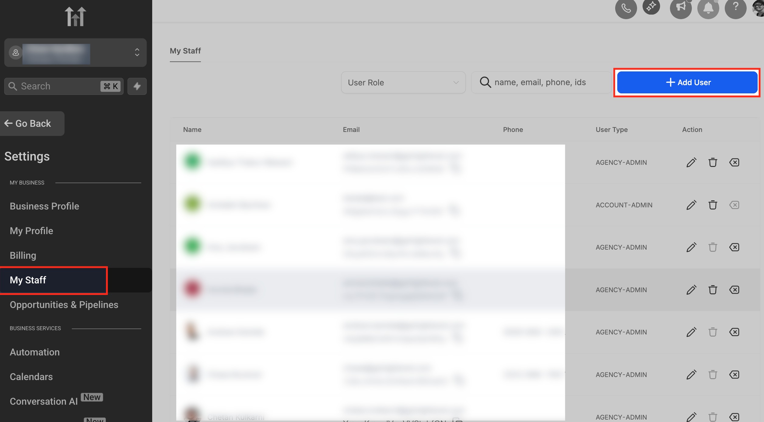 From your subaccount dashboard, Navigate to Settings → My Staff → Add User.