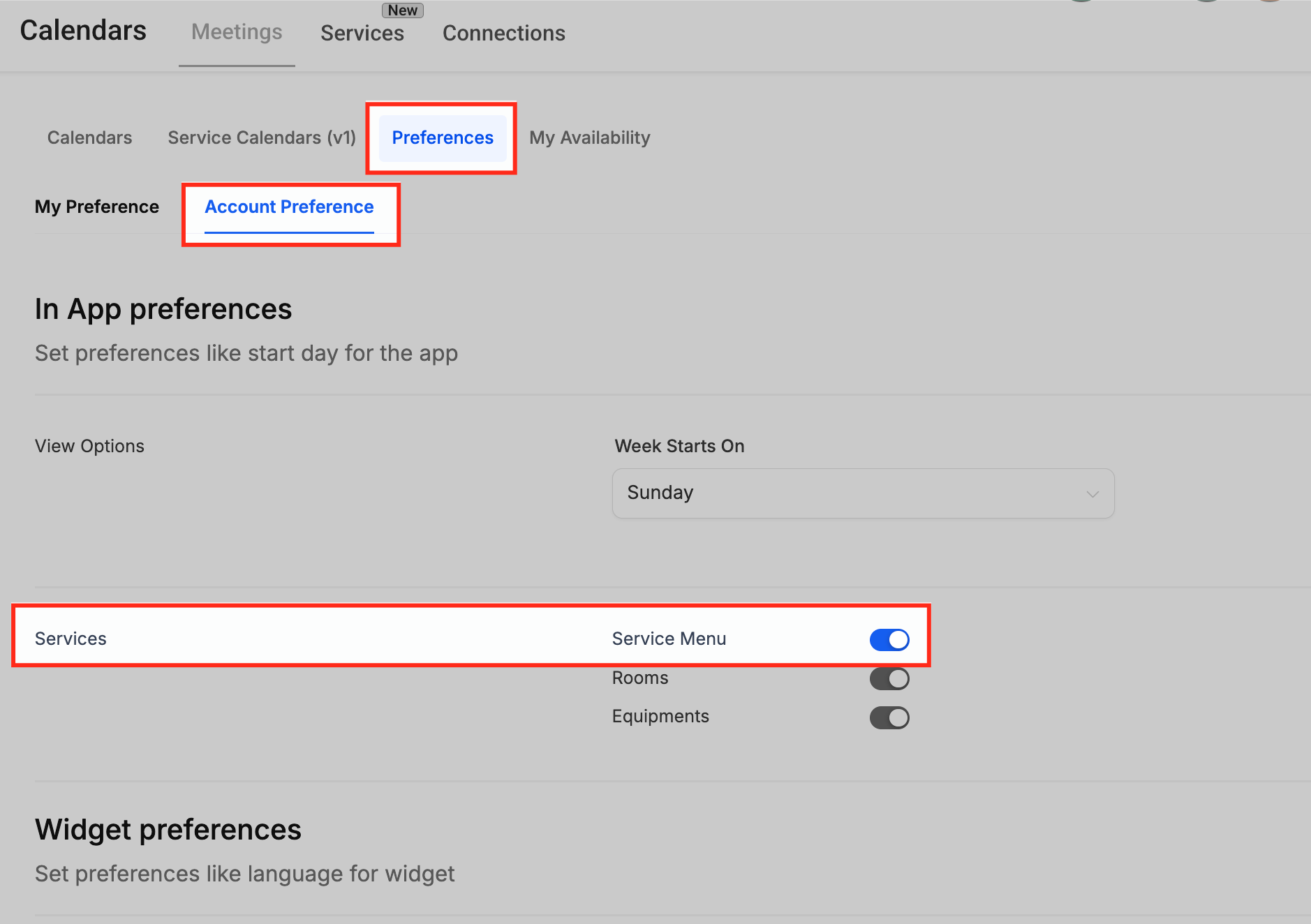 Go to Preferences → Account Preference and toggle the Service Menu option on. This activates the service-based booking system so you can create service calendars and menus.