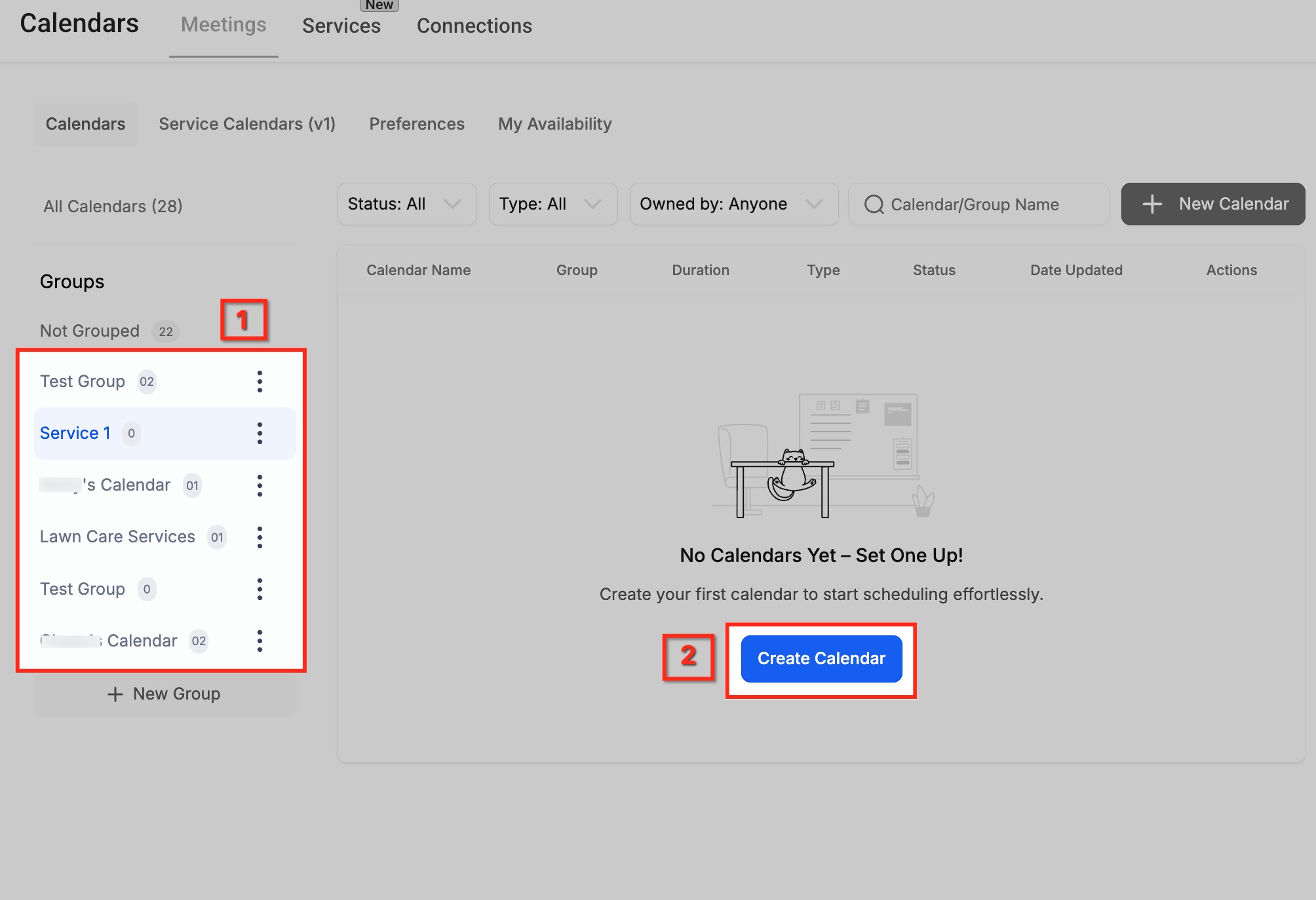 In the Calendars tab, click + New Group on the left sidebar. Groups help you organize related services such as haircuts, shaves, or styling.